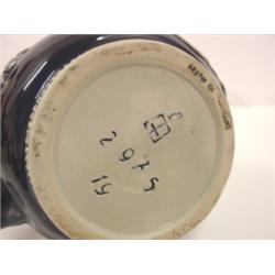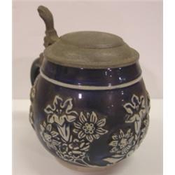 GERMAN RELIEF DECORATED STEIN. Decorated with relief floral decoration. Blue glaze. Marked on bottom "2975-19" and "Made in Germany". 4.75" H