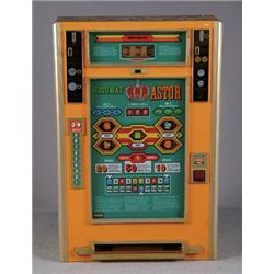 GERMAN "ROTOMAT ASTOR" SLOT. 1970's European gold-tone electronic slot machine with reverse decorated glass of regal imagery with hexagonal windows that reveal various currency amounts. Comes with manual and operating instructions (in German) and power converter allowing for domestic use. SIZE: 23” w x 34-1/2” t x 8-1/4” d. CONDITION: Untested but consignor claims it to be in good working condition; no key, but unlocked. 1-3115