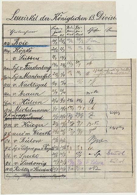 Partial D.S., 1p. 8vo., [France, ca. 1916-18], a list of 17 officers of the King's 13th Div. of the German Army listing (likely part of a roster), signed or initialed by each. Very good. This was a top-notch regiment, fighting in both battles of the Somme, the Marne, and the Meuse-Argonne offensive. Very good.
