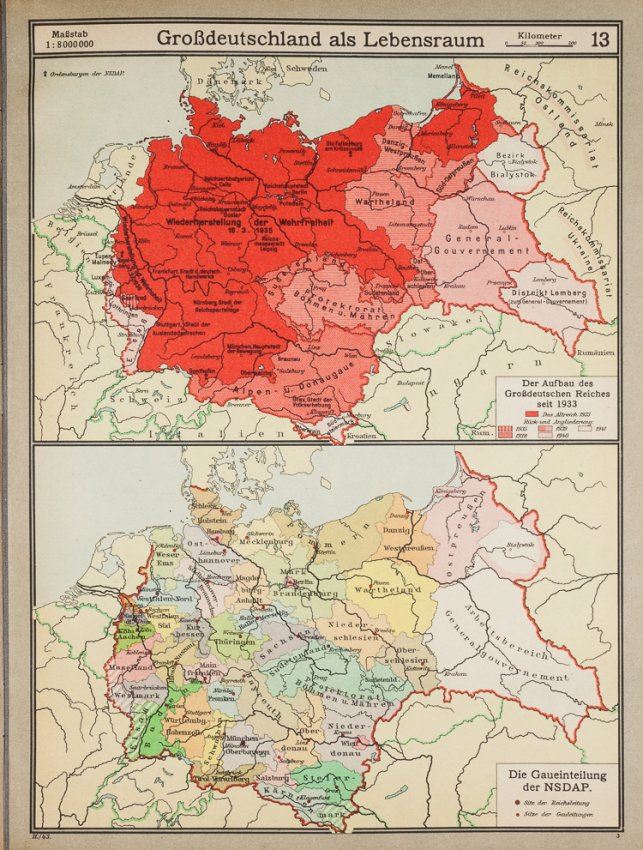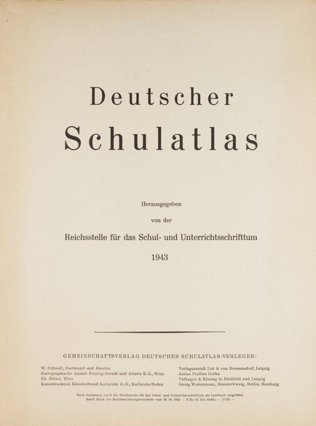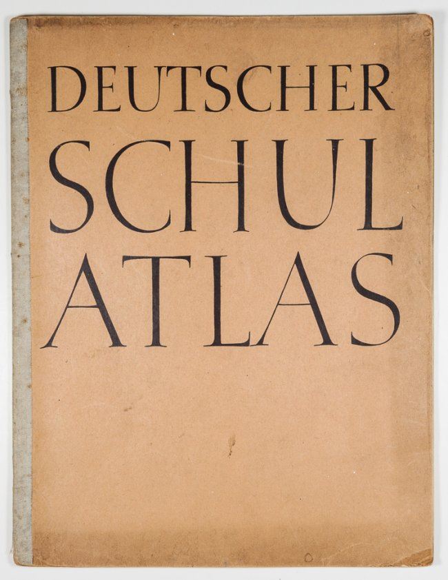 German atlas printed for use by German school children during the later war years, 34pp. 9 ?" x 12 ?", issued by various presses in Germany and Austria, 1943, with foreword by Baldur von Schirach. Of particular interest are maps showing "lebensraum" in Europe, including those lands occupied by Germany in Russia and Eastern Europe, as well as Pacific islands "under Japanese control". Very good.