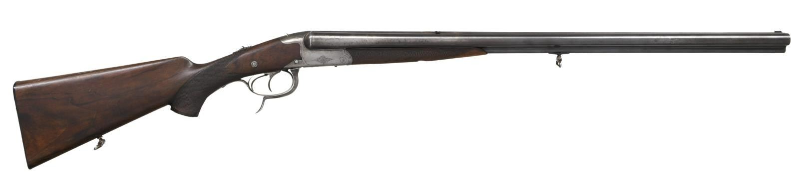 Cal. 16 Ga. / 9.3x72R. S# 6675. Bbls. 26 7/8" w/ slightly raised rib & doll's head extension. Blade front sight & flip up rear sight. Full & Mod chokes. Water tables have pre WWII German proofs w/out date code. Blitz style action w/ Greener style safety, cocking indicators, dbl. triggers, under lever & top tang bbl. selector marked in gold letters "SCHROT". Walnut stock set w/ sling swivels & left side cheekpiece. LOP: 13" to hard rubber buttplate. CONDITION: Bbls. have good blue showing carry wear & light pitting around breech section, edge wear, & peppery oxidation throughout. Receiver has gray patina appearance showing vivid case colors in protected areas along w/ marks & patina throughout. Wood has good varnish w/ lightly worn checkering, large long scratches throughout alongside impressions. Buttplate appears fair w/ wear. Shotguns bores show heavy fouling. Rifle bore has good rifling w/ light pitting. (23-1156/MD). CURIO. $600-900.