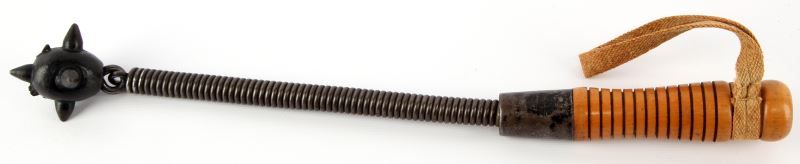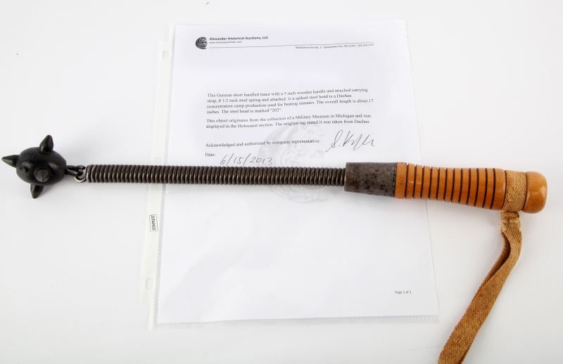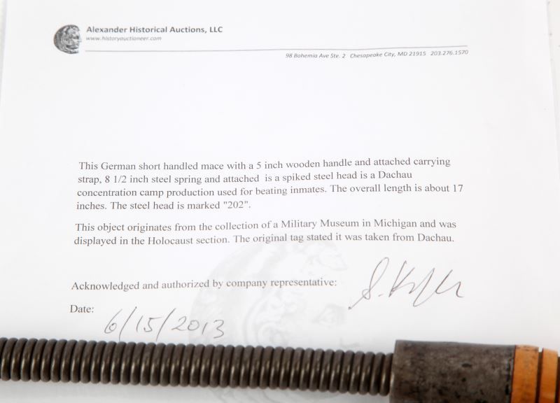 German short handled mace with a spiked steel head from the Dachau concentration camp. Steel head is marked "202". Mace comes with certificate of authenticity from Alexander Historical Auctions, LLC.