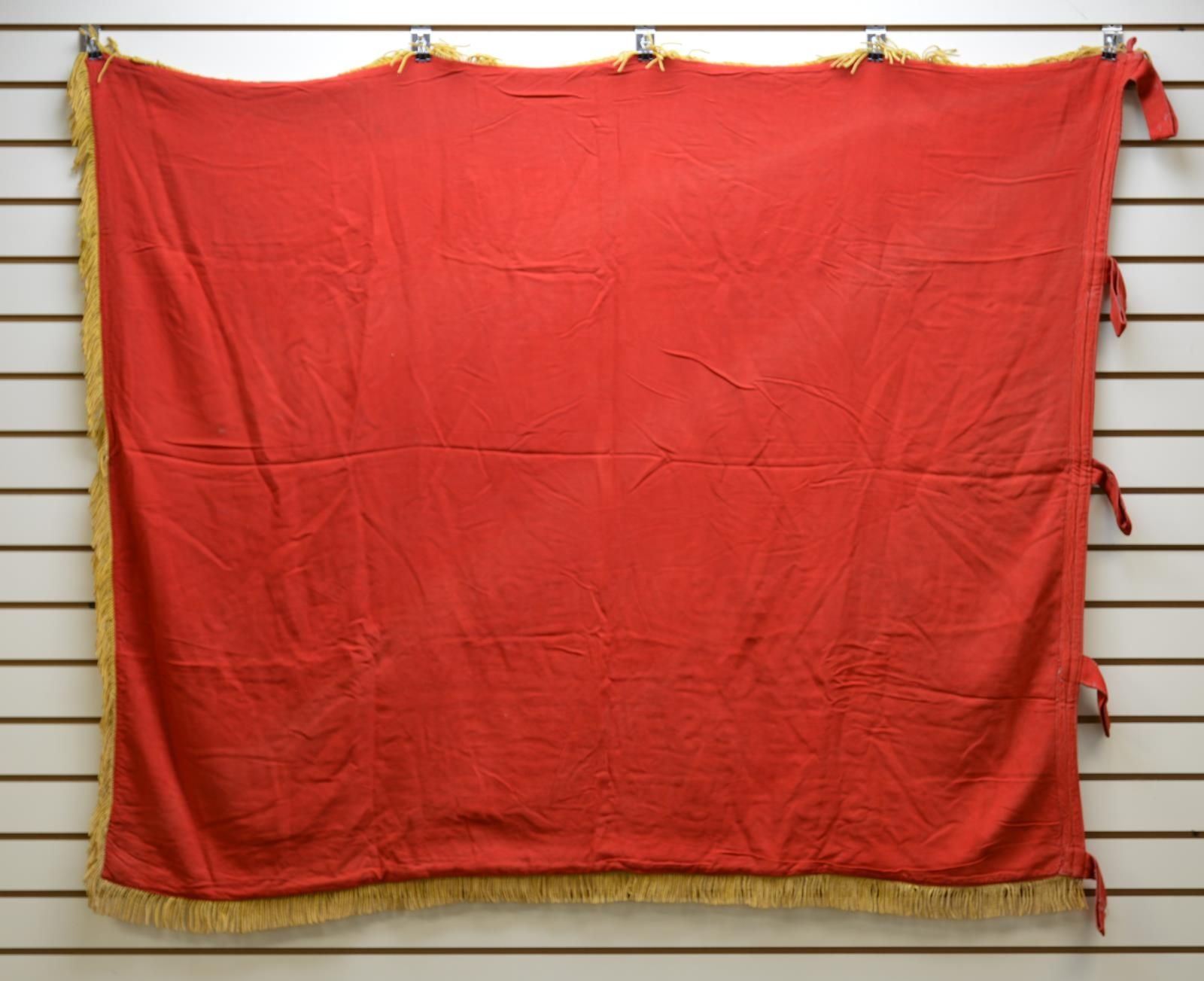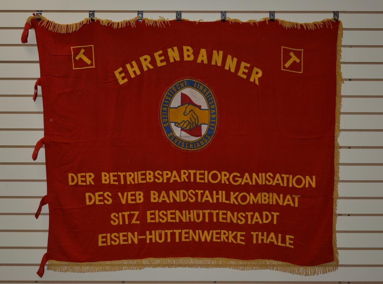 51” x 41” plus fringe, embroidered on red field. Central medallion: “SOCIALIST UNITY PARTY OF GERMANY”, text translates: “HONOR BANNER” / The operating party organization of Veb Bandsteelkominat / HDQ Eisenhuttenstadt / Iron Smelter Works Thale”. CONDITION: Very good overall. (02-17547-4/JS). $400-600.