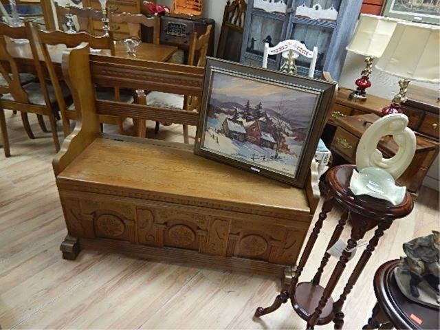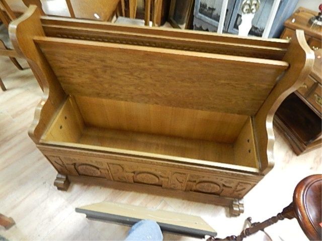 GERMAN SOLID OAK CARVED HALL BENCH WITH STORAGE
