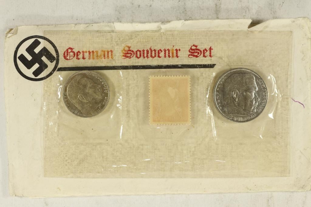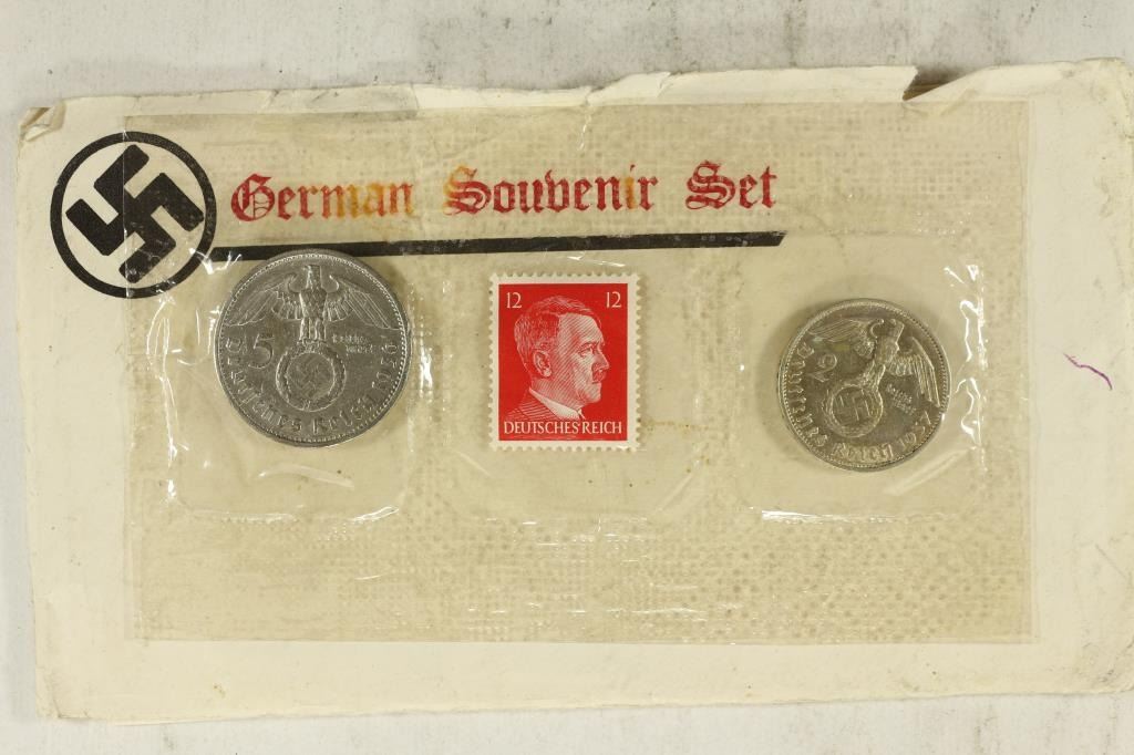 1936 SILVER 5 MARK BOTH WITH SWASTIKAS AND MINT UNUSED GERMAN HITLER STAMP