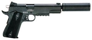 Threaded BRL AMBIDEXTROUS SAFETY N BARREL LENGTH IN INCHES 5.0000 CALIBER .22 LONG RIFLE DRILLED AND TAPPED N FINISH BLACK FRAME MATERIAL ALLOY GRIP MATERIAL POLYMER MAGAZINE CAPACITY 10.0000 NUMBER OF MAGAZINES INCLUDED 1.0000 OTHER FEATURES: SAME SPEC AND WEIGHT OF A REAL 1911 .45 COMPATIBLE W/OTHER 1911 PARTS BEAVER TAIL AND GRIP SAFETY BLACK PLASTIC GRIPS TYPE ACTION FUNCTION SEMI-AUTO TYPE OF SIGHTS FIXED WEIGHT IN OUNCES 34.4000 OTHER FEATURES2: PICATINNY RAIL FAUX SUPPRESSOR THREADED BARREL, MADE IN GERMANY NO SALE TO CALIFORNIA