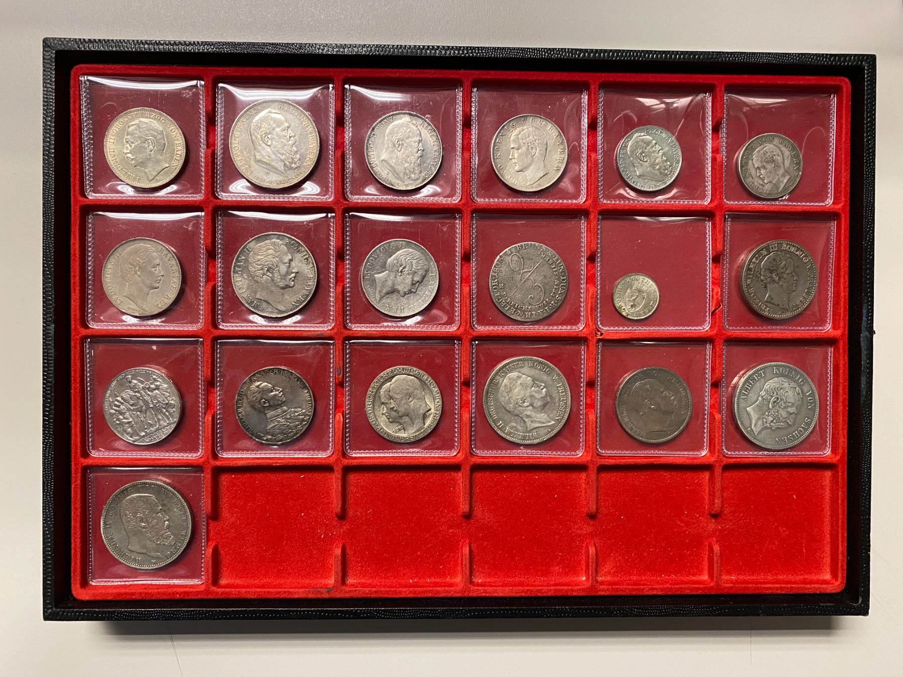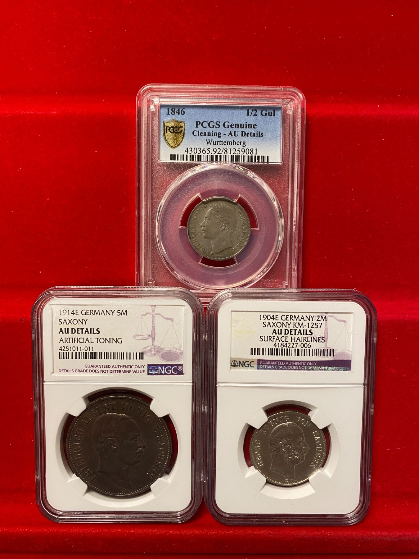 GERMAN STATES: LOT of 22 coins, including Baden (1 pc), Bavaria (8), Brunswick-Lüneburg-Calenburg-Hannover (1), Prussia (6), Saxony (3, including 1914-E 5 mark NGC AU details Artificial Toning and 1904-E 2 mark NGC AU details surface hairlines), and Württemberg (3, including 1846 1/2 gulden PCGS AU details cleaning); average circulated grades, with some better, all are silver, in consignor's holders and slabs, viewing recommended; retail value $900, lot of 22 pieces.