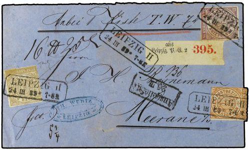1864 Registered envelope to Meerane bearing 1/4 groschen purple (SG 2), 1/2 groschen orange (SG 5) and 5 groschen brown (SG 10) tied by boxed LEIPZIG datestamp with adjacent registered label and instructional boxed AUSGELIEFEET. Very fine three colour franking in superb quality.