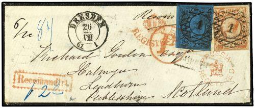 (1851 CA) DRESDEN a SCOTLAND. 2 ngr. azul y 5 ngr. castaño rojo. Carta certificada, marca PRUSSIA/REGISTERED en rojo.