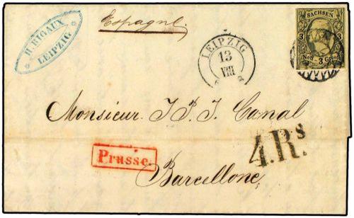 1860 (Aug 13th) Entire letter to Barcelona, SPAIN franked by 1855 3ngr black on yellow tied by Leipzig ´2´ numeral. Framed red ´Prusse´ alongside and charged ´4Rs´ due on receipt in black. A very rare destination and an attractive cover. Scott 12.