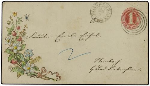 1863 (April 23) Beautiful hand-painted 1sgr. rose postal stationery envelope cancelled by numeral ´225´ with corresponding Blankenhain despatch cds at left. Arrival datestamp on reverse and charged ´2´ silver groschen due in blue manuscript. A lovely cover.