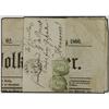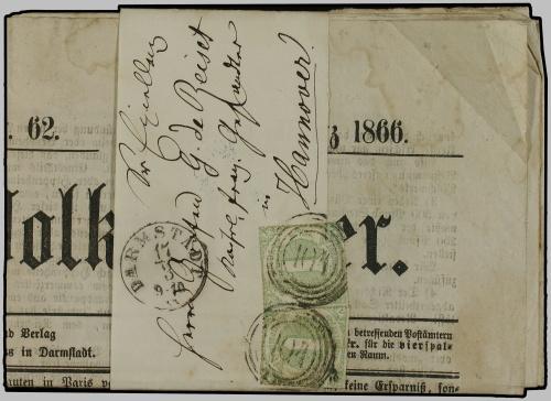 1866 (March 17) Complete Newspaper mailed from Darmstadt to Hannover franked by two rouletted 1865 1kr. green tied by ´104´ numerals with Darmstadt cds alongside. Reverse with Hannover arrival (March 18) in blue. A scarce and appealing usage. Scott 56.