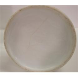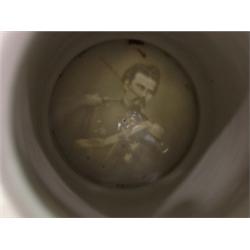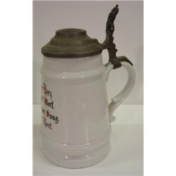 GERMAN STEIN WITH RELIEF SOLDIER DECORATION IN BOTTOM. Decorated with German text on body. Slight hairline crack near top. Spider line cracks on bottom visible on both inside and outside. 1 liter.