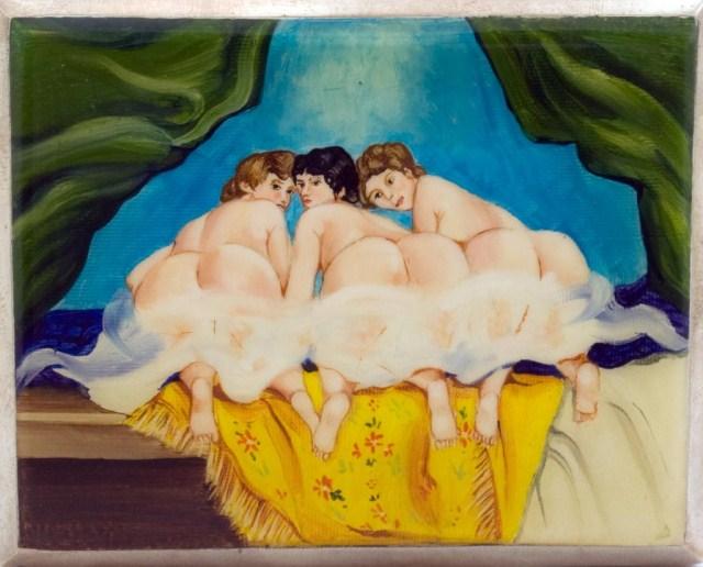 Front has enchanting nude woman scene done in a vibrant enamel work. Back has a vertical line design. Interior is gold washed and has a German monogram dated 1933. Piece is marked with the number 83 and 3583. Has four leaf clover mark. Also marked 925. Hinge and latch are in great condition. Measures 3 1/4" h X 4" w X 7/16" d.