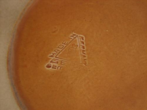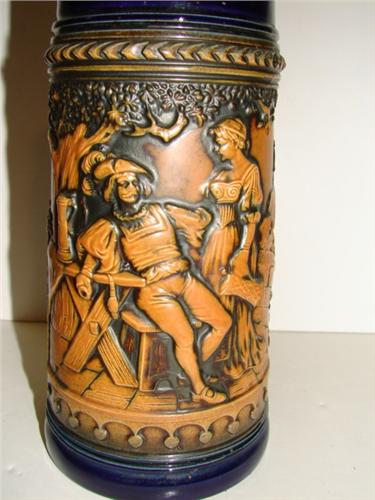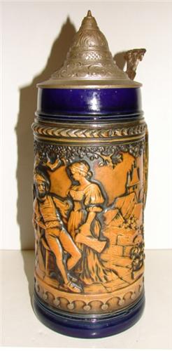 GERMAN STONEWARE STEIN. Has relief decorated scene with male & female. Marked on bottom “Made in Germany”. Has silver plate top and lid. 11” H