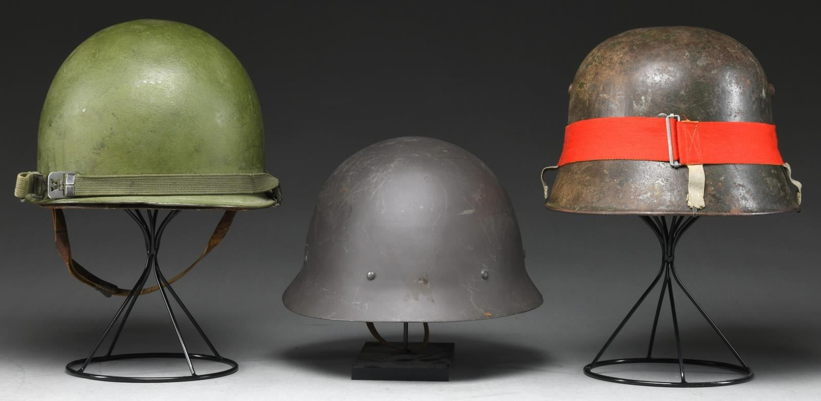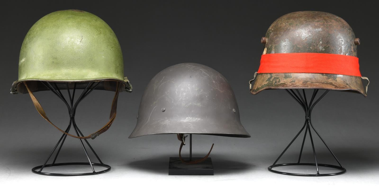 1) GERMAN. This M1918 helmet is an early reissue to WWII German forces. It has a Wehrmacht eagle decal on the left side, and the national colors decal on the right. The helmet has a dark green painted finish and is fitted with a bright red maneuver band. Helmet has its original 8-tongue brown leather liner with an interior label that reads "Pfalzer Gg. 18. (E) 71.-R. 40". Original black leather chinstrap. CONDITION: helmet retains approx. 50% of its original finish. The Wehrmacht decal is 60% complete, and the national colors decal is 70% complete. The liner & chinstrap show wear but remain quite solid. 2) SWEDISH. A fine example of an M1926 Swedish military helmet. The outside has a dark field green finish. The interior has a 3-pad brown leather liner with a brown leather chinstrap. The rear interior has a black ink stamp that appears to read "Kcf 72". CONDITION: helmet is unissued and shows only storage wear. 3) US. A standard WWII era M1 helmet with a medium green painted finish. Helmet is a front seam example with swivel bales and correct WWII era liner. This helmet includes a size 7 insulating helmet liner from the 1960's in OD green with Velcro closure. CONDITION: helmet shows light wear overall with the majority of the original finish intact. (02-19794/BF). $500-800.