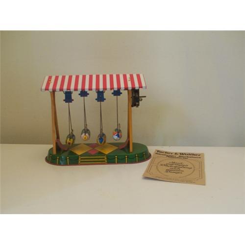 A really great tin wind-up swing set, from Germany. <P> <P> Piece is made completely of tin, is aproximately six and one-half inches in height, and is eight inches long. <P>Tin wind-up was made by Tucher and Walther, in Germany, manufacture was Niirnberger Blechwaren Manufactur. <P> This is really a nice wind-up tin toy, and is not a reproduction, they begin making tin toys in 1979, beautiful tin toys, and very collectable. <P> Really nice piece to add to a tin toy collection or to add to a collection of toys.