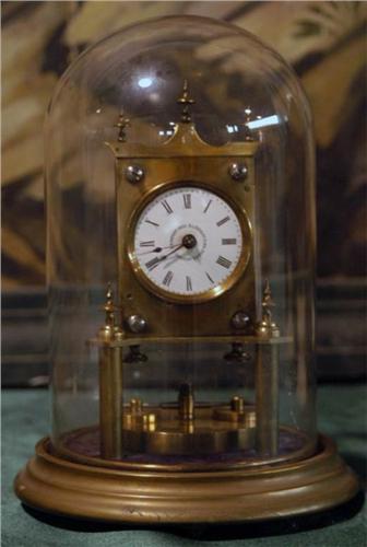 GERMAN TORSION-PENDULUM 400 DAY CLOCK with glass dome, 10" high overall, with U.S. patent numbers on porcelain face, circa 1882, suspension now detached, condition: excellent otherwise, PACKING AND SHIPPING (excluding insurance) $40