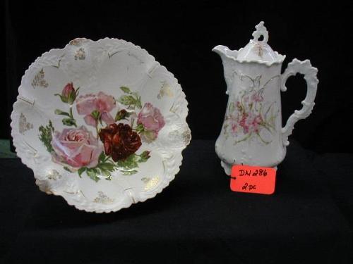 GERMAN TRANSFER FLORAL INCLUDES (1) 10 3/8in FTD. CHOCOLATE POT BRUNSWICK GERMANY (CURSIVE F W/CROWN GREEN) EXCELLENT, (1) 10 3/8in BOWL MARKED P & S GERMANY EXCELLENT, 2 PC