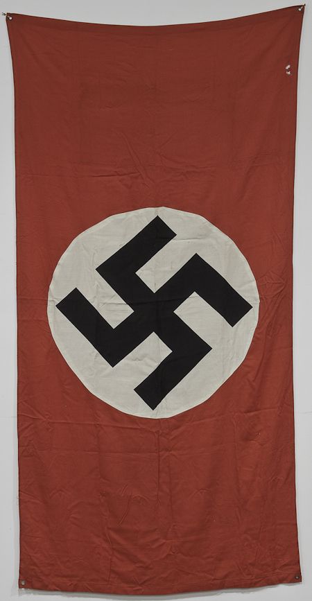 German vehicle identification flag, 37" x 73", bearing an oversize swastika made of separate sections of fabric on one side only, with four grommets attached at corners in order to secure the flag to the vehicle. These flags were most commonly used on armored vehicles at the front so that they would not be mistaken as enemy vehicles from the air. A few very scattered small moth holes, else very good to fine.