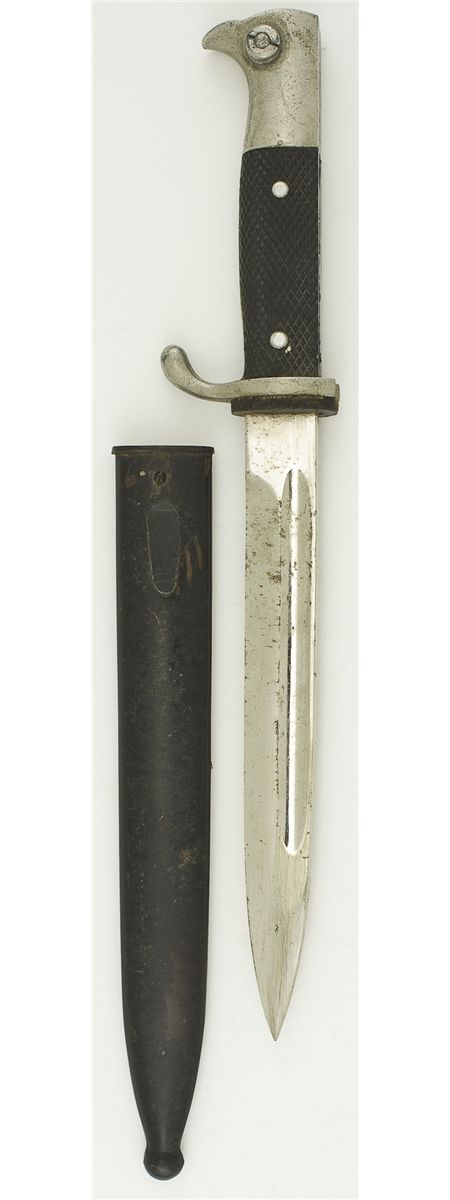 World War II German dress bayonet, Robert Klaas ("Kissing Crane"), Solingen manufacture, 12 1/2" overall, checkered grip with leather ring, scabbard present. The chromed blade bears some pitting and oxidation, scabbard likewise shows some oxidation.