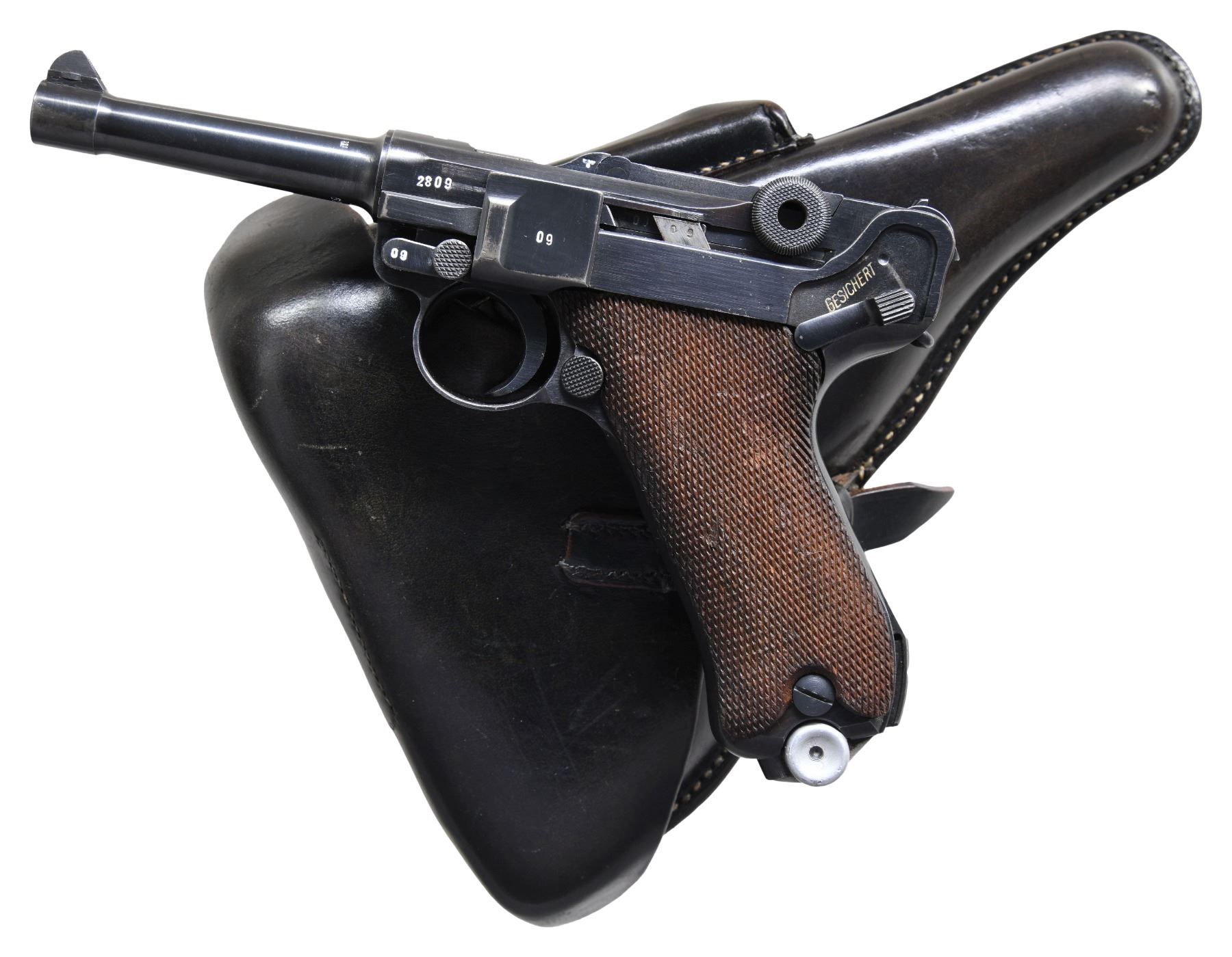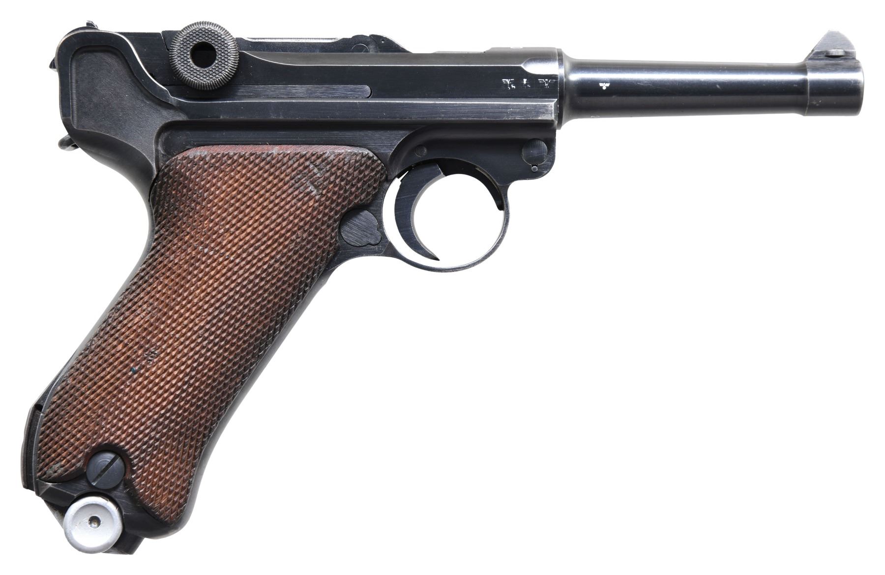 P.08 LUGER SEMI-AUTOMATIC PISTOL WITH HOLSTER. Cal. 9mm Luger. S# 2809m. Bbl. 4". P.08 Luger semi-automatic pistol mfg. by Mauser in 1940. The top of the bbl. extension is marked "1940" over the chamber, with Mauser Eagle/655 proofs and an eagle firing proof marked on the right. Toggle is marked with Mauser's "42" mfg. code. Metal components exhibit a salt blue finish overall. Frame is mounted with 2-piece checkered wood grips. Dovetailed blade front sight, with fixed V-notch rear sight. All serialized parts are matching and include the frame, takedown lever, sideplate, trigger, safety lever & bar, hold-open latch, bbl., bbl. extension, trigger bar, breechblock, extractor, firing pin, toggles, rear toggle pin, as well as the mag. Grip screws are contemporary replacements. MAGS: 1 matching 8-rd., and 1 post-war 8-rd. marked "2/1001". UNATTACHED ACCESSORIES: black leather holster marked "P.08", followed by an encircled "GRAF/ 1940/ LEIPZIG", and an Eagle/WaA170" on the rear, containing an unmarked loading tool. CONDITION: excellent, with metal components retaining bountiful amounts of their blue finish, exhibiting some concentrated spots of wear and thinning, as well as some scattered spots of light surface oxidation overall. Very bright bore, exhibiting light pitting in the grooves and on the edges of the lands, while retaining well defined rifling throughout. Grips show some light smoothing, as well as scattered superficial marks and minor impressions from handling and storage. Holster remains malleable, exhibiting some light wear, as well as some light age related cracking and crazing. (24-6911/MLW). CURIO. $1,200-1,800.