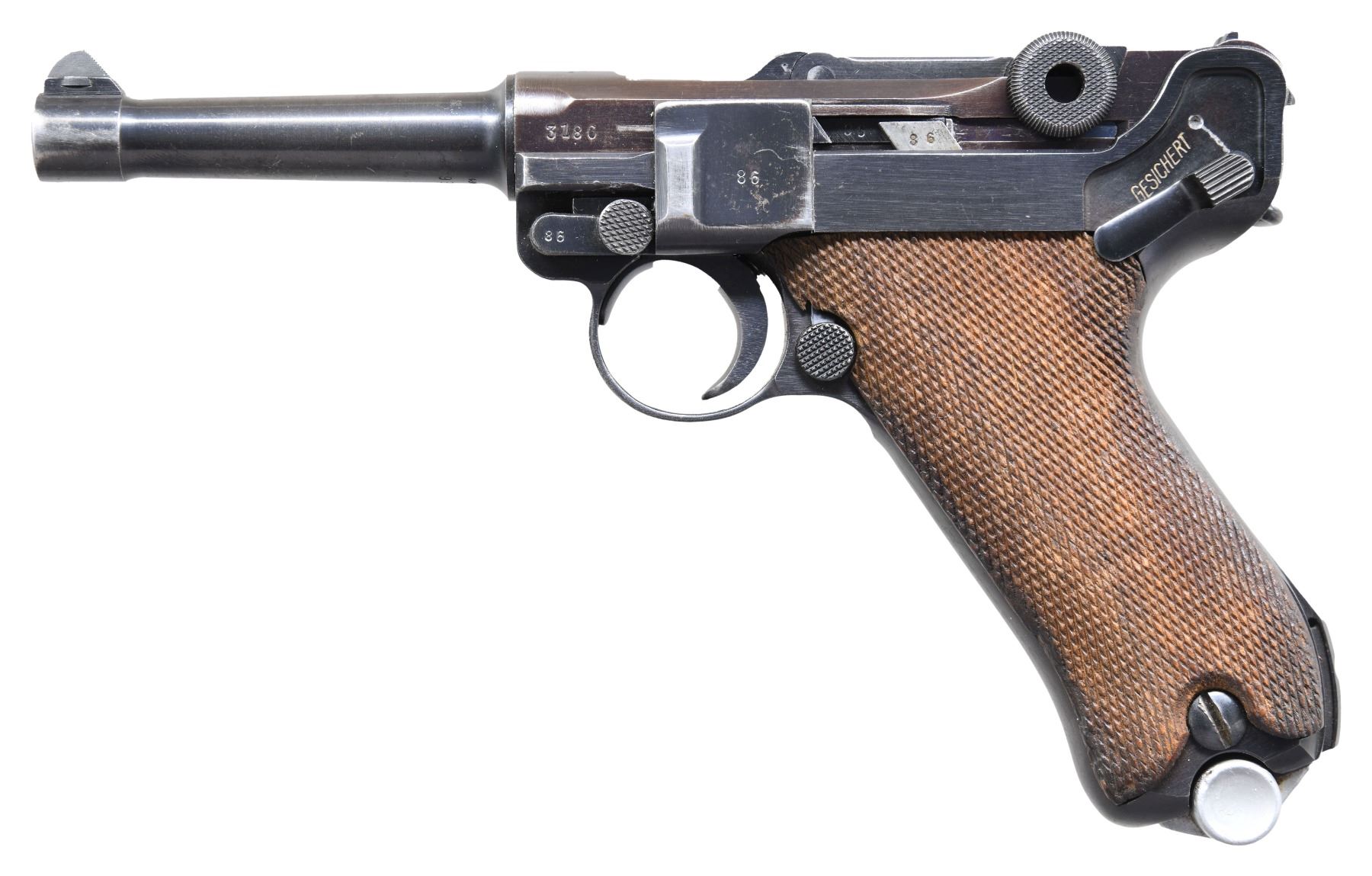 P.08 LUGER SEMI-AUTOMATIC PISTOL. Cal. 9mm Luger. S# 3186p. Bbl. 4". P.08 Luger semi-automatic pistol mfg. by Mauser for the German military in 1939. Top of the bbl. extension is marked with the 4-digit year of mfg. "1939", with Mauser Eagle/63 proofs marked on the right. Toggle is marked with Mauser's "S/42" mfg. code. Metal components exhibit a salt blue finish overall. Frame is mounted with 2-piece checkered wood grips. Dovetailed blade front sight, with fixed V-notch rear sight. All serialized parts are matching and include the frame, takedown lever, sideplate, trigger, safety lever & bar, hold-open latch, bbl., bbl. extension, trigger bar, breechblock, extractor, firing pin, toggles, rear toggle pin, as well as the grips. MAGS: 1 blued matching 8-rd. with Eagle/63 proofed aluminum bottom. CONDITION: metal components retain the majority of their original arsenal salt blue finish, exhibiting some areas of light to mild wear and thinning (primarily on the bbl., bbl extension, and edges), some superficial handling marks, as well some scattered spots of light to mild surface oxidation and pitting. Bright bore, exhibiting mild pitting, while retaining well defined rifling throughout. Grips show mild smoothing, as well as some superficial marks and minor impressions from handling and storage, but otherwise remain sturdy and serviceable. PROVENANCE: the Estate Collection of Charles Wagner. (25-297/MLW). CURIO. $1,200-1,800.