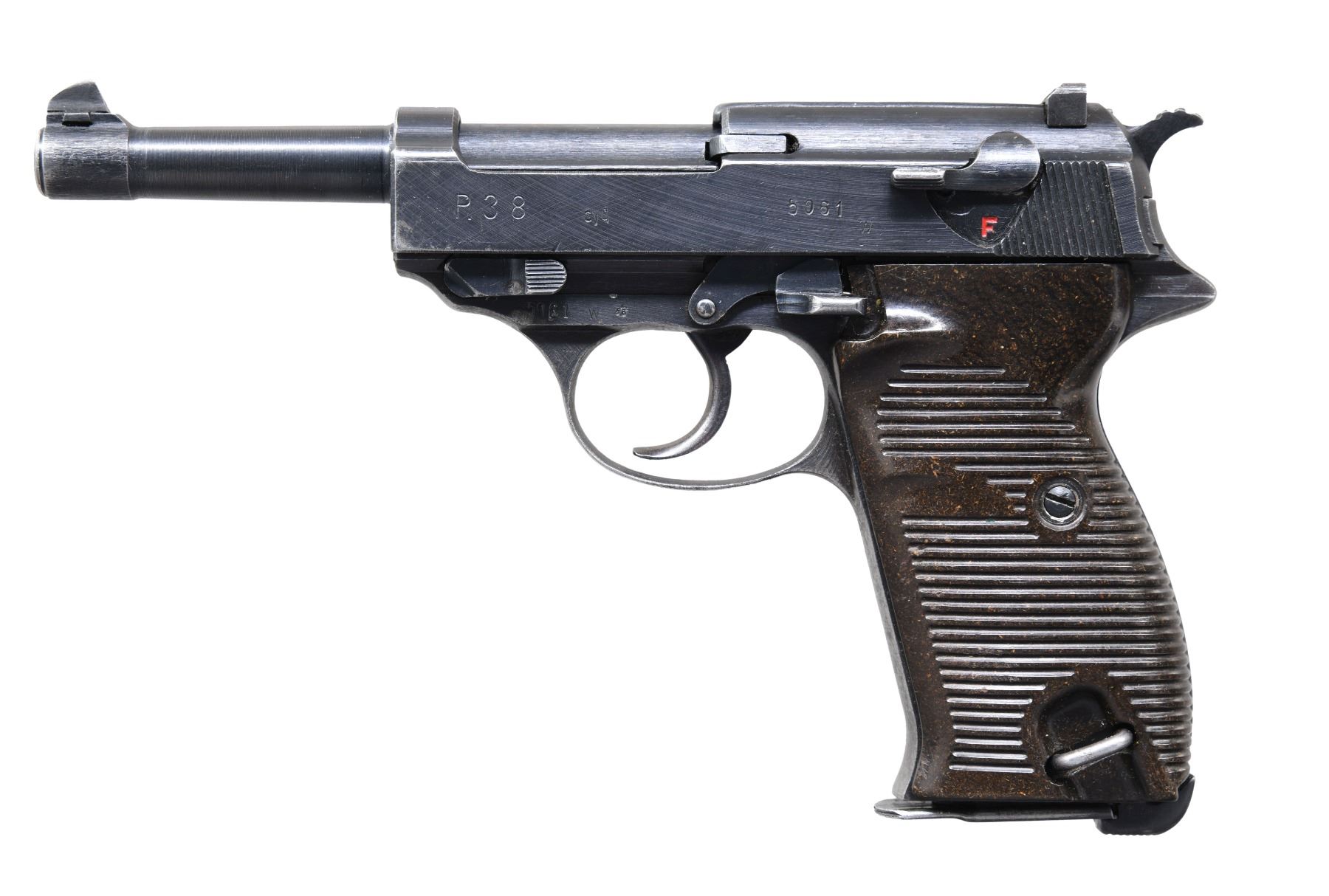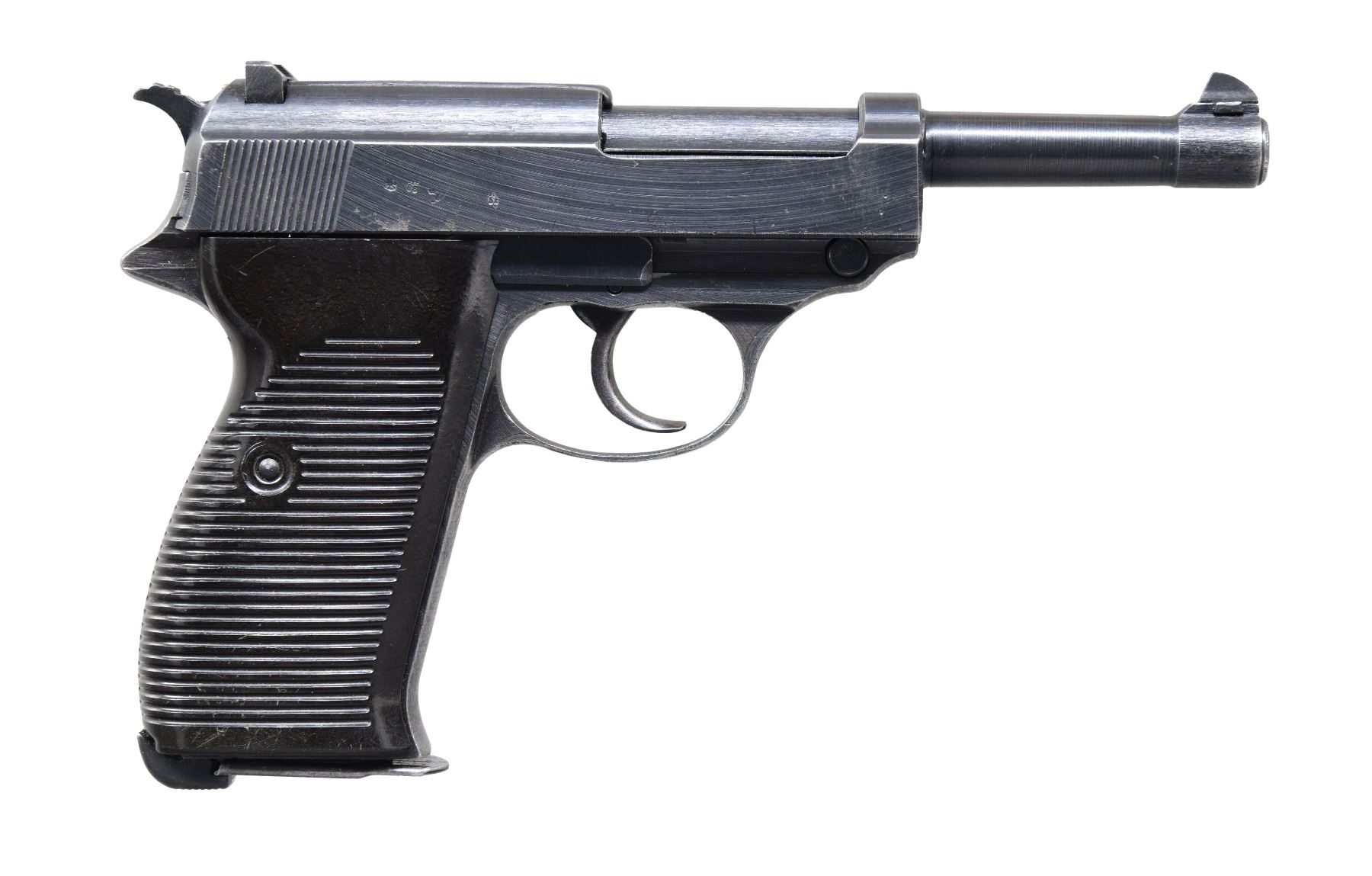 SEMI-AUTOMATIC PISTOL. Cal. 9x19mm. S# 5061w. Bbl. 4 7/8". P.38 semi-automatic pistol mfg. by Spreewerke during World War II. Left side of the slide is marked "P.38", followed by Spreewerke's "cyq" mfg. code and the S#, with a starburst rework (likely for out of spec. parts), 2 Spreewerke Eagle/88 proofs, and an eagle firing proof marked on the right. Metal components exhibit a dull blue military finish overall. Frame is mounted with 2-piece grooved wood grips, with the left panel being comprised of pressed resin, and the right panel appearing to have been made from a brown synthetic material. Dovetailed blade front sight, with U-notch rear sight. All serialized parts are matching and include the frame, slide, bbl., and locking block. MAGS: 1 unmarked blued 8-rd. CONDITION: metal components retain the majority of their original arsenal blue finish, exhibiting some areas of light to mild wear and thinning, some superficial handling marks, as well as a few scattered spots of light to mild oxidation and pitting. Front grip strap and underside of the trigger guard exhibit wear through to gray patina. Very bright bore, exhibiting some light pitting, while retaining well defined rifling throughout. Grips show some superficial marks from handling and storage, but otherwise remain sturdy and serviceable. (24-7208/MLW). CURIO. $700-1,000.