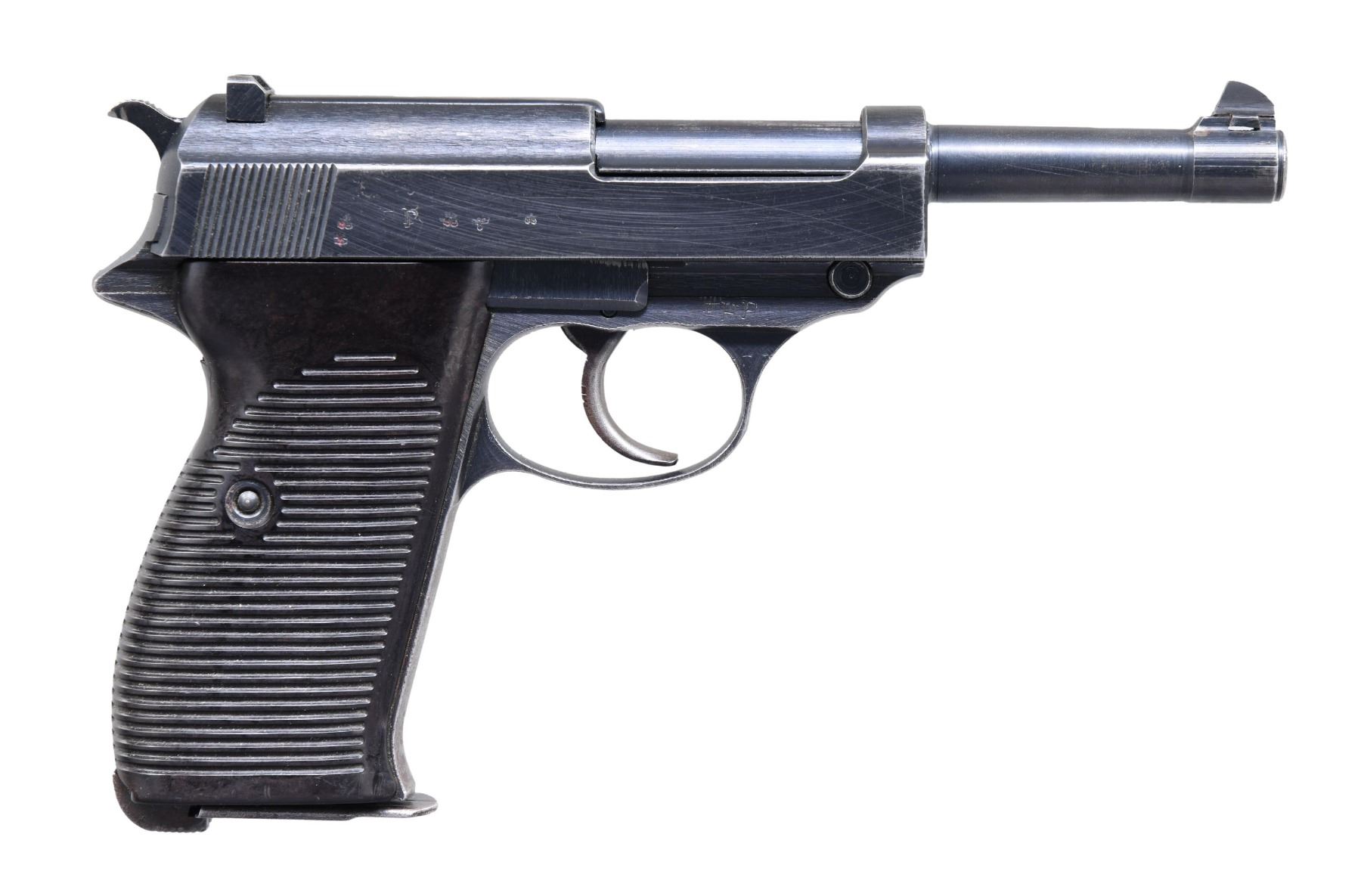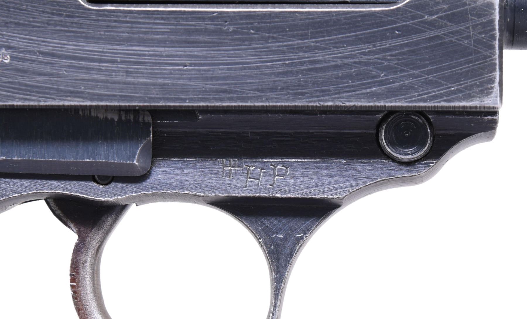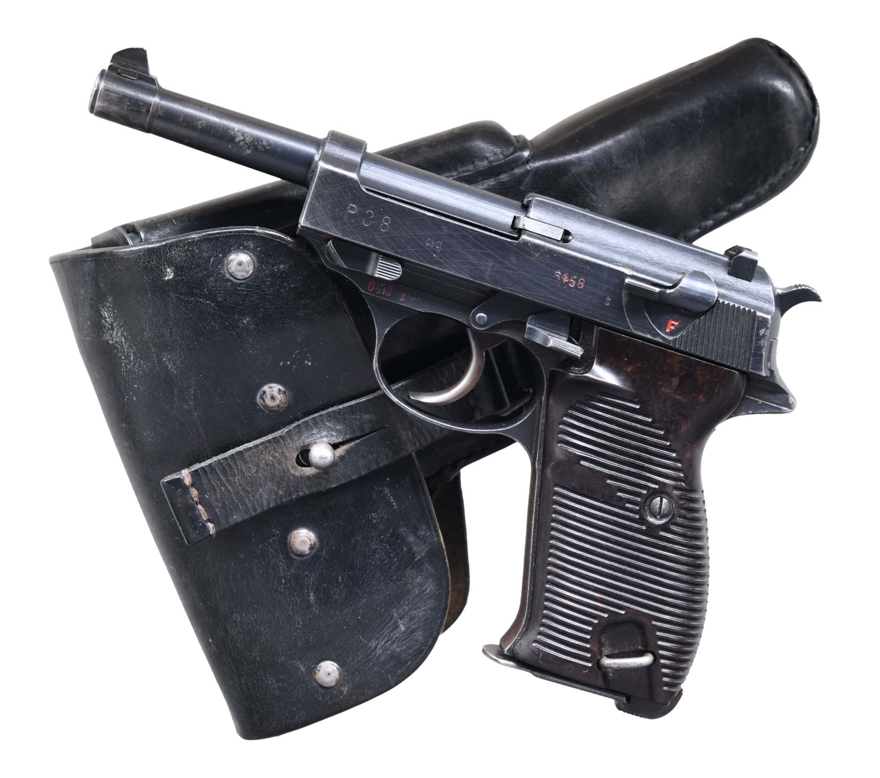 PISTOL WITH POST-WAR HOLSTER. Cal. 9x19mm Parabellum. S# 6458s. Bbl. 4 7/8". P.38 semi-automatic pistol mfg. by Spreewerke during World War II. Left side of the slide is marked "P.38", followed by Spreewerke's "cyq" mfg. code, and the S#. Right side of the slide is stamped with an Eagle/88 above a star rework proof, followed by "H P", 2 additional Eagle/88 proofs, and an eagle firing proof. Right side of the frame is marked with an additional unidentified "HP" stamp. Metal components exhibit a blue finish overall. Frame is mounted with 2-piece dark brown grooved pressed resin grips. Standard blade front sight and U-notch rear sight. All serialized parts are matching and include the frame, slide, bbl., and locking block. MAGS: 1 8-rd. UNATTACHED ACCESSORIES: post-war black leather holster marked "12-120-0169/ B. MEYER GRONAU" on the rear. CONDITION: metal components retain the majority of their original arsenal blue finish, exhibiting areas of wear and thinning that show through to gray patina, with some scattered spots of light surface oxidation and pitting present overall. Bore exhibits consistent mild to moderate pitting, while retaining well defined rifling throughout. Safety lever decocker functions appropriately when cycled by hand. Grips are very good, showing some scattered superficial handling marks overall. Holster remains malleable, exhibiting wear, with areas of light age related cracking overall. (25-521/MLW). CURIO. $500-800.