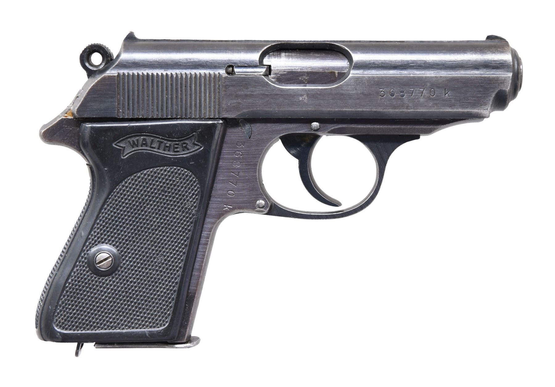 SEMI-AUTOMATIC PISTOL. Cal. 7.65mm. S# 368770k. Bbl. 3 1/4". Model PPK semi-automatic pistol mfg. by Walther in 1942 for the German military. The left side of the slide is marked with the Walther banner logo, followed by markings stipulating Walther's mfg. information, as well as the model and cal. designations. Left side of the frame and slide are marked with a Walther Eagle/WaA359 acceptance proof. Metal components exhibit a blue finish overall. Frame is mounted with a 1-piece Walther banner checkered black synthetic grip. Slide features a grooved matte rib, with a fixed blade front sight and fixed U-notch rear sight. Matching numbers are present on the frame and slide. MAGS: 1 7-rd. CONDITION: metal components retain the majority of their original arsenal blue finish, exhibiting some areas of light to mild wear and thinning, as well as a few scattered superficial handling marks and spots of light surface oxidation overall. Mirror bore, exhibiting some spots of grease, while retaining well defined rifling throughout. Grip shows some mild age related warping, as well as some smoothing and scattered superficial marks from handling and storage, but otherwise remains sturdy and serviceable. PROVENANCE: the Estate Collection of Charles Wagner. (25-331/MLW). CURIO. $1,000-1,500.