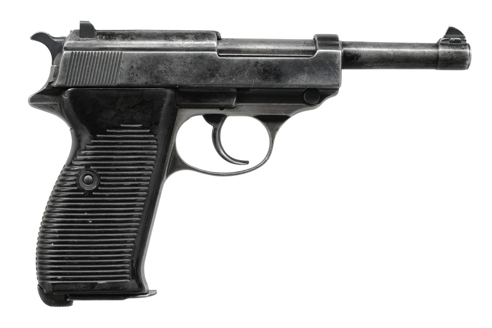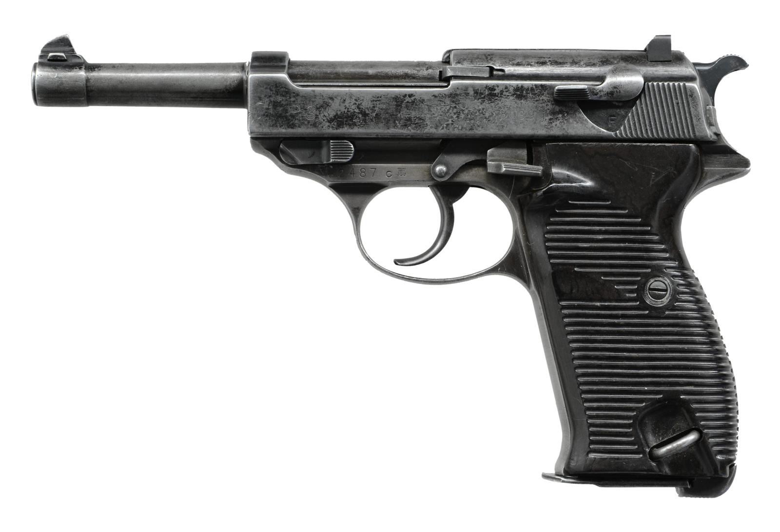 PISTOL. Cal. 9x19mm Parabellum. S# 2487c. Bbl 4 -7/8". Reapplied black enamel finish with 2-piece grooved pressed resin grips. "ac/41" code on left side of slide. No matching numbers present. CONDITION: Poor, with metal components retaining traces of their reapplied black enamel finish, exhibiting wear and thinning overall that shows through to gray patina. Fair bore exhibiting moderate pitting and retaining strong rifling throughout. Grips show some scattered marks from storage and handling, but are otherwise fine. (23-1849/MLW). CURIO. $300-400
