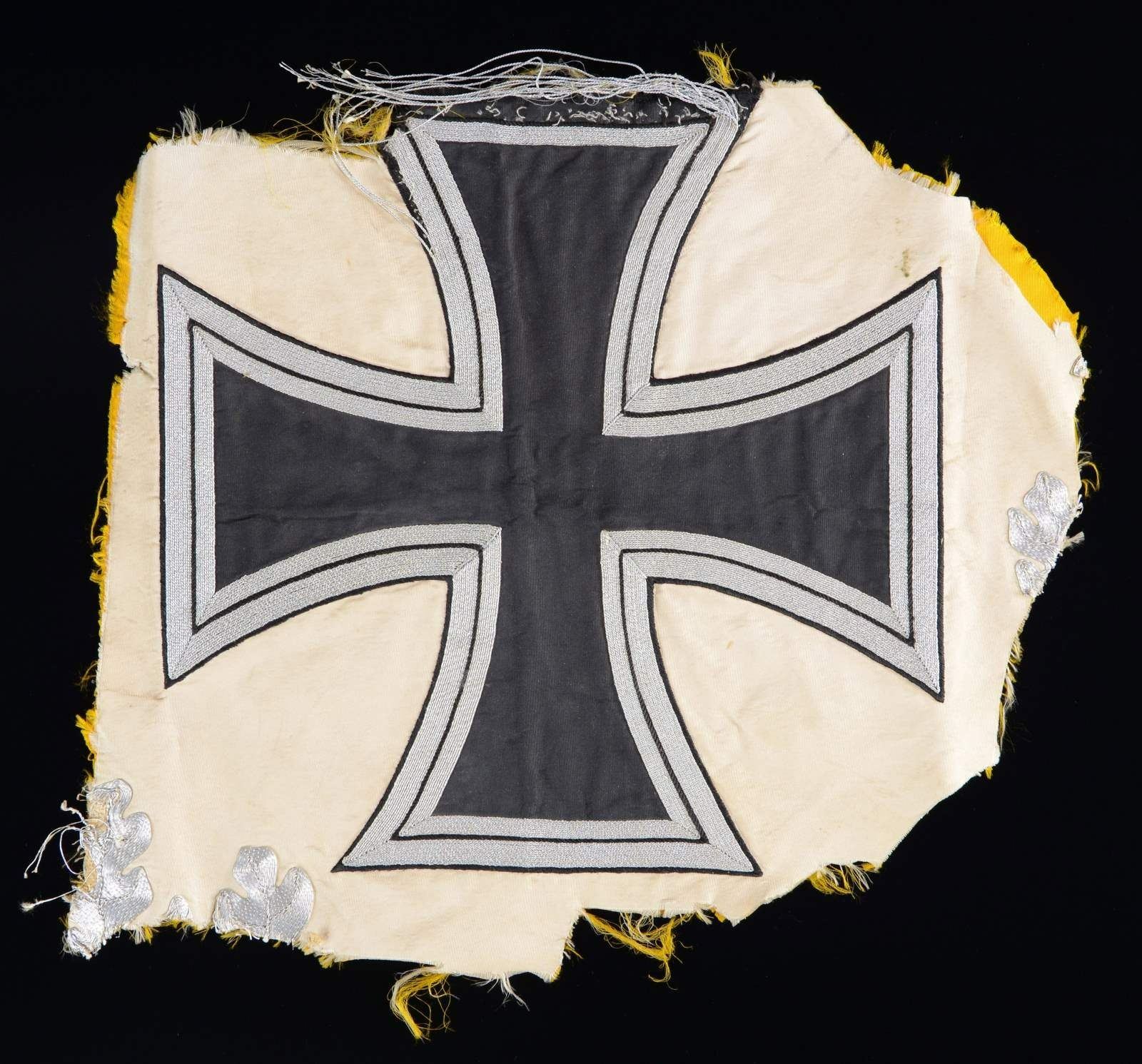 FLAG. 12.5” x 12.5” silver embroidered iron cross, taken from German regimental standarte with yellow cloth backing which originally made the field of the Luftwaffe flag. Accompanying souvenired iron cross are two vintage photographs of Luftwaffe standards in the field. UNATTACHED ACCESSORIES: sales receipt 2001. CONDITION: good for the fragment, one layer of bullion trim is unraveled with losses. (02-19982-24/JS). $200-300.