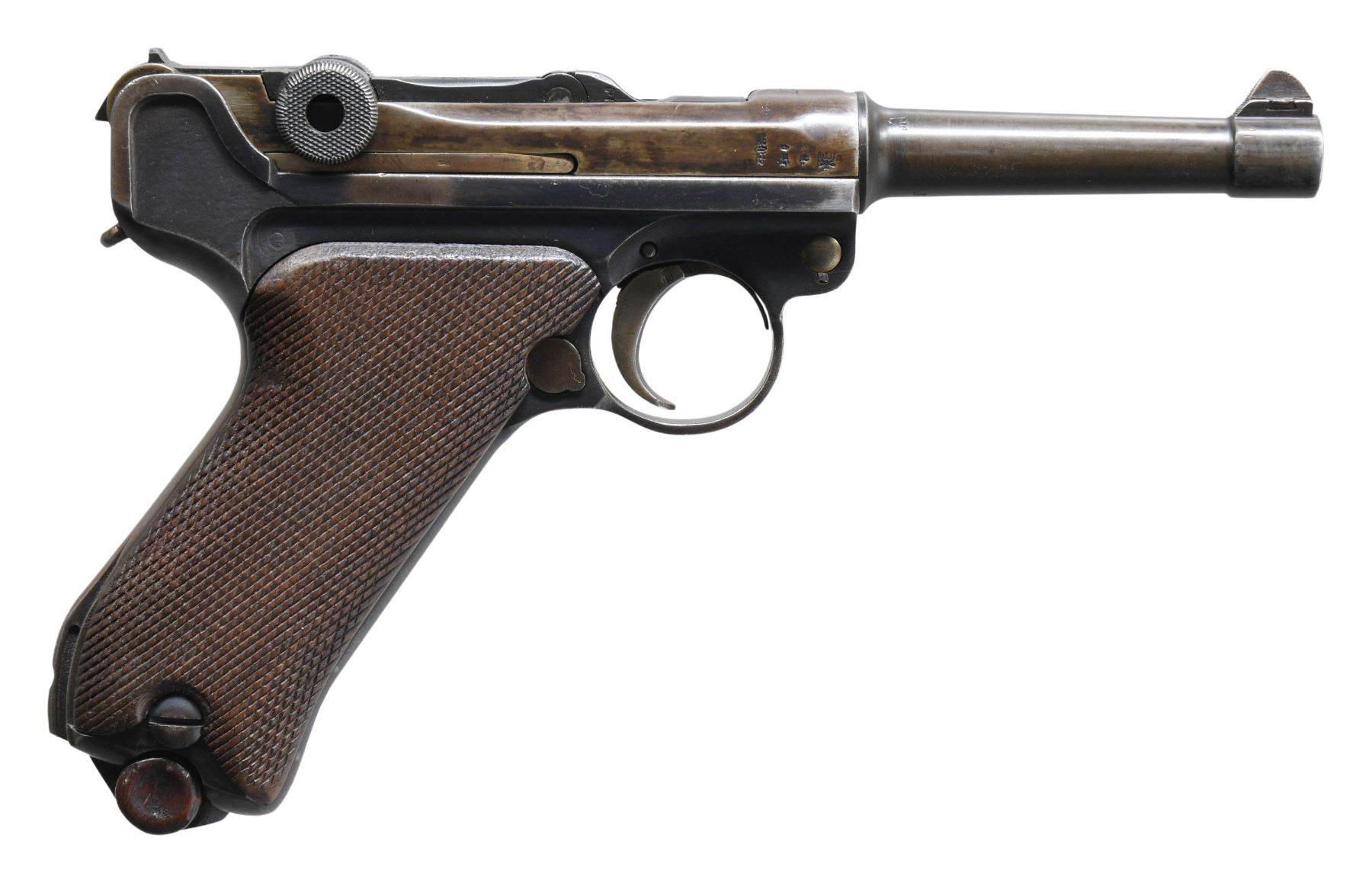 SEMI-AUTOMATIC PISTOL WITH HOSLTER. Cal. 9mm Luger. S# 8780h. Bbl. 4". P.08 Luger semi-automatic pistol mfg. at the Erfurt arsenal in 1917. Bbl. extension is marked "1917" over the chamber, with Erfurt arsenal proofs marked on the right (and repeated on various parts overall). Metal components exhibit an older reapplied blue finish overall, with some small parts exhibiting a reheated straw finish. Frame is mounted with 2-piece checkered wood grips, which appear to have been lightly sanded. Dovetailed blade front sight with fixed V-notch rear sight. All serialized parts are matching (including the grips), save for on the firing pin, which is unnumbered. MAGS: 1 8-rd. with unmarked wood plug. UNATTACHED ACCESSORIES: WWII production black leather P.38 holster mfg. by Carl Heinichen, marked "joa/ 1943" above an Eagle/WaA706 proof on the rear. CONDITION: metal components retain fair amounts of their reapplied blue finish, exhibiting wear and thinning that shows through to brown patina. Front and rear straps of frame exhibit consistent light pitting, with an area of moderate pitting present on the rear and left side of the frame. Bore exhibits consistent light to mild pitting, while retaining good rifling throughout. Grips show smoothing and some scattered marks and impressions, but otherwise remain sturdy and serviceable. Holster remains malleable, exhibiting general overall wear, with some light age related cracking and crazing. PROVENANCE: Estate Collection of Nicholas Apergis. (25-3967/MLW). CURIO. $500-700.