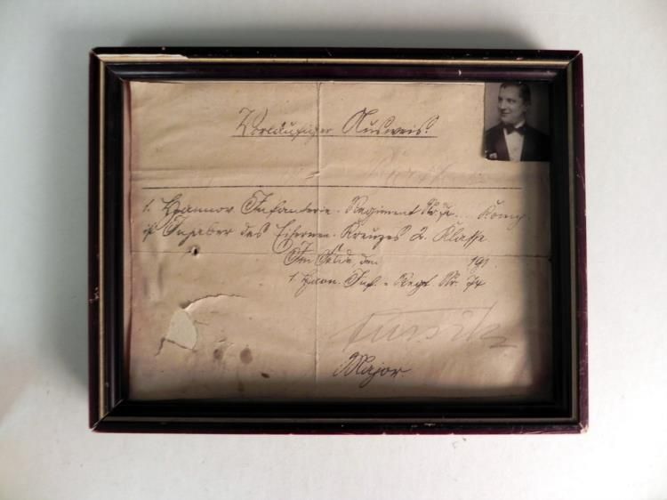 GERMAN WWI FRAMED DOCUMENT W/ PIC OF REGT 74 SOLDIER IN TUXEDO-SIGNED BY SERGEANT---INTERESTING WWI DOCUMENT FROM SOLDIER SERVING IN THE 74TH REGIMENT WITH PHOTO OF MAN IN CIVILIAN TUXEDO.--REVERSE HAS CORRESPONDING DOCUMENT OF INDUCTION SIGNED 4/2/1918 IN BERLIN AND SIGNED BY FELDWEBEL (SERGEANT)