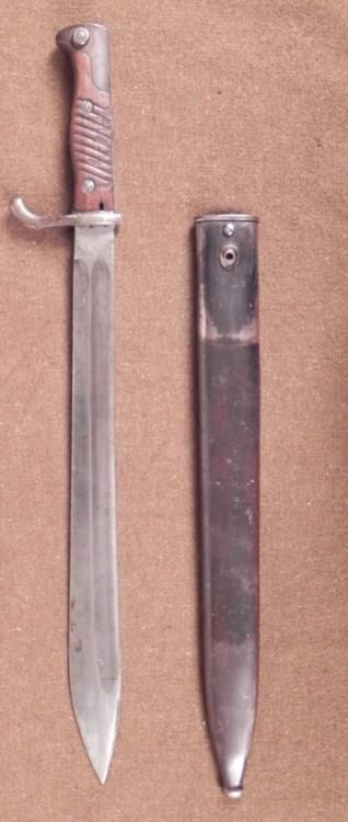 GERMAN WWI M1898/05 BUTCHER BAYONET BY ALEX COPPEL-SOLINGEN-1915 MARKED * ORIGINAL 1915 GERMAN BUTCHER BAYONET WITH SCABBARD-MODEL 1898/05 (K98)--RICASSO MARKED MAKER "ALEX COPPEL-SOLINGEN---SPINE MARKED "CROWN L 15 & PROOF MARK"--FROG PRONG NOT PRESENT & DENT IN SCABBARD MAKES IN-AND-OUT DIFFICULT (BUT NOT IMPOSSIBLE)-RARE BAYONET