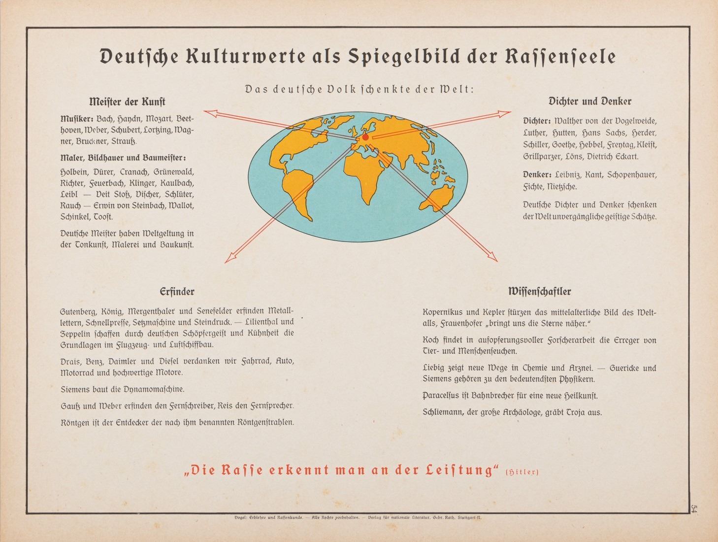 German WWII teaching poster titled 'German cultural values as a mirror image of the racial soul' and what the 'German people gifted the world': masters of art, poets and thinkers, scientists and inventors. Page 54 from Alfred Vogel's portfolio 'Heredity, Pedigree and Race Knowledge in Pictorial Representation' (Rassenkunde in bildlicher Darstellung) which was used in German schools to teach 'Racial Science.' 11.5 x 15.5 inches, 1 page.