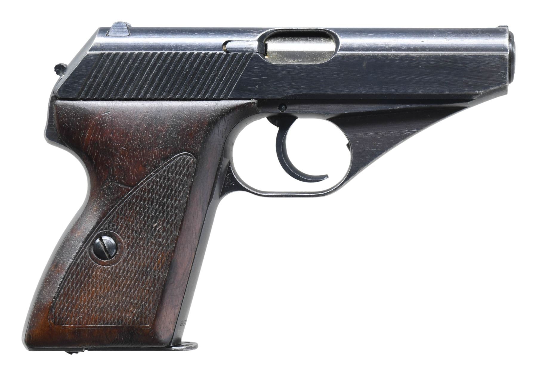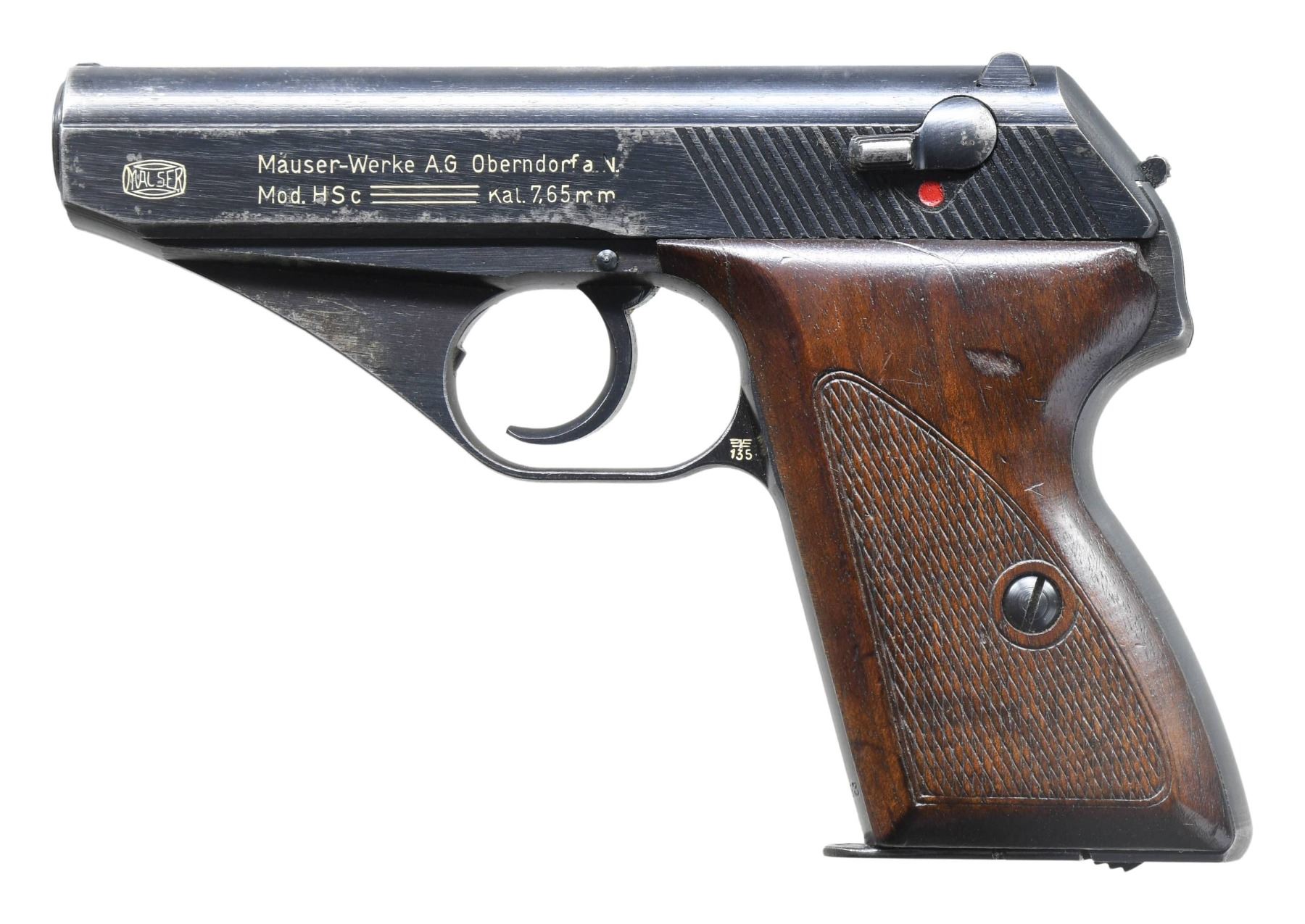 PISTOL. Cal. 7.65mm. S# 876983. Bbl. 3 1/4". HSc semi-automatic pistol mfg. by Mauser for the German military during World War II. Left side of the slide is marked with the Mauser banner logo, followed by "Mauser-Werke A.G Oberndrof a.N/ Mod. HSc (3-LINES) Kal. 7,65mm". Left side of the rear trigger guard web is marked with a Mauser Eagle/135 proof, with a German Eagle/N commercial nitro proof (repeated on right side of slide) marked on the right. Metal components exhibit a salt blue finish overall, save for on the bbl., which is polished in-the-white. Frame is mounted with 2-piece flat checkered wood grips. Slide features a smooth sight groove, with an integral blade front sight and dovetailed U-notch rear sight. All serialized parts are matching and include the frame, slide, and bbl. MAGS: 1 8-rd. with 7 transverse indicator holes. CONDITION: metal components retain the majority of their original arsenal blue finish, showing light to mild edge wear, scattered spots of finish loss, and some spots of light to mild pitting. Grip straps and underside of trigger guard exhibit mild wear and thinning fading to gray and brown patinas. Mirror bore, exhibiting a few scattered spots of mild to moderate pitting, while retaining well defined rifling throughout. Proper manual mechanics. Grips show some scattered marks and impressions from handling and storage, with the left panel exhibiting a repaired break at the top left corner. Mag. body shows a mottled gray patina, with some mild pitting on the right side. (25-3731/MLW). CURIO. $400-600.