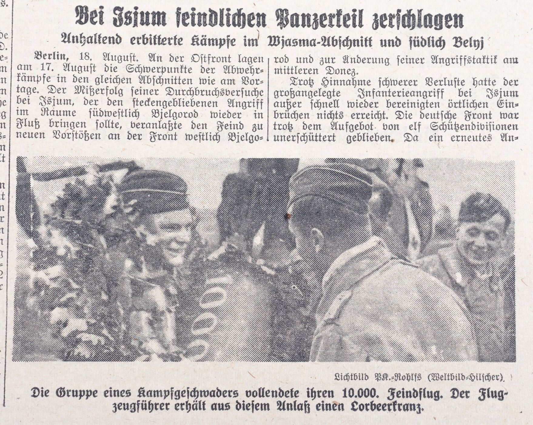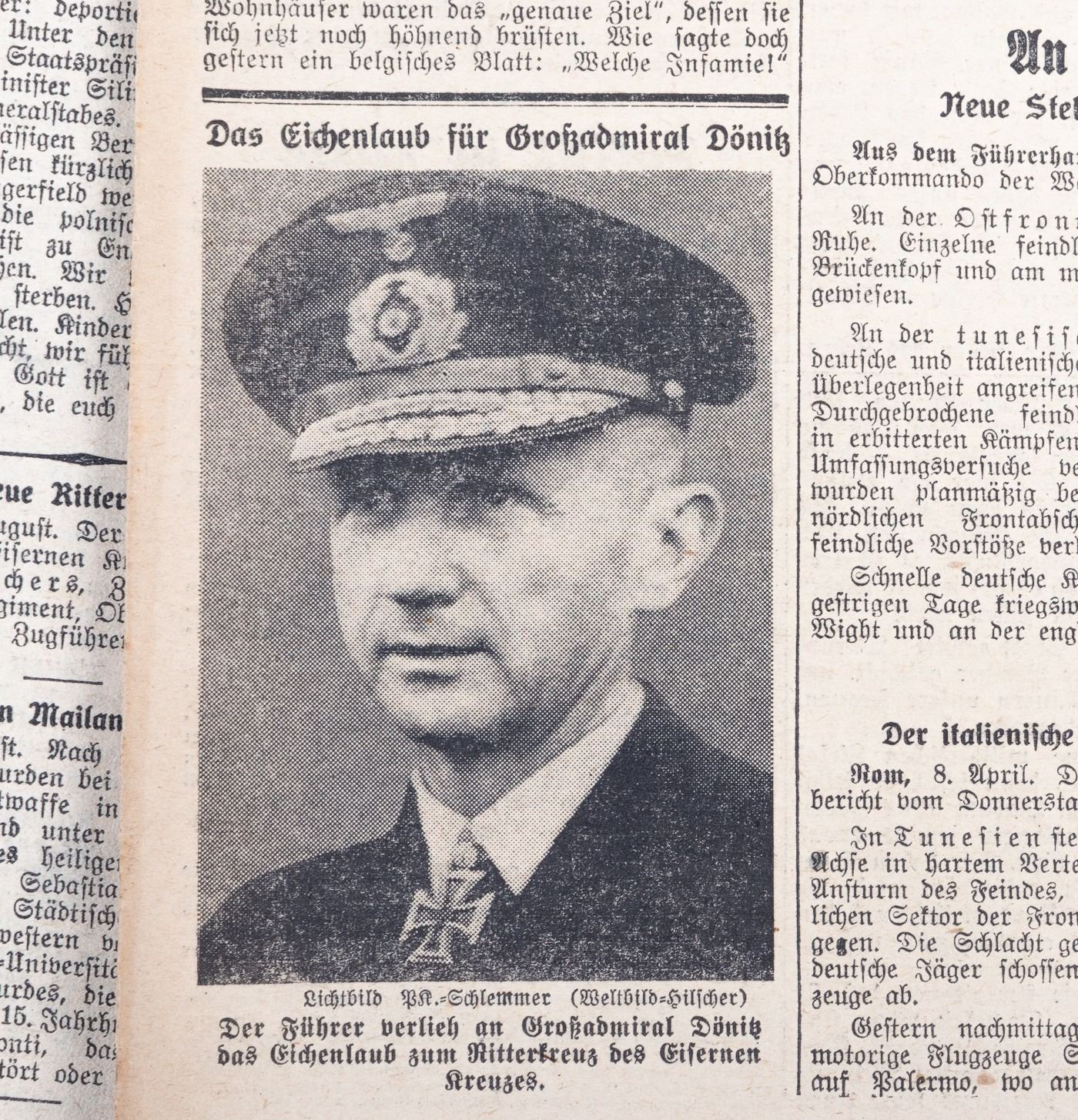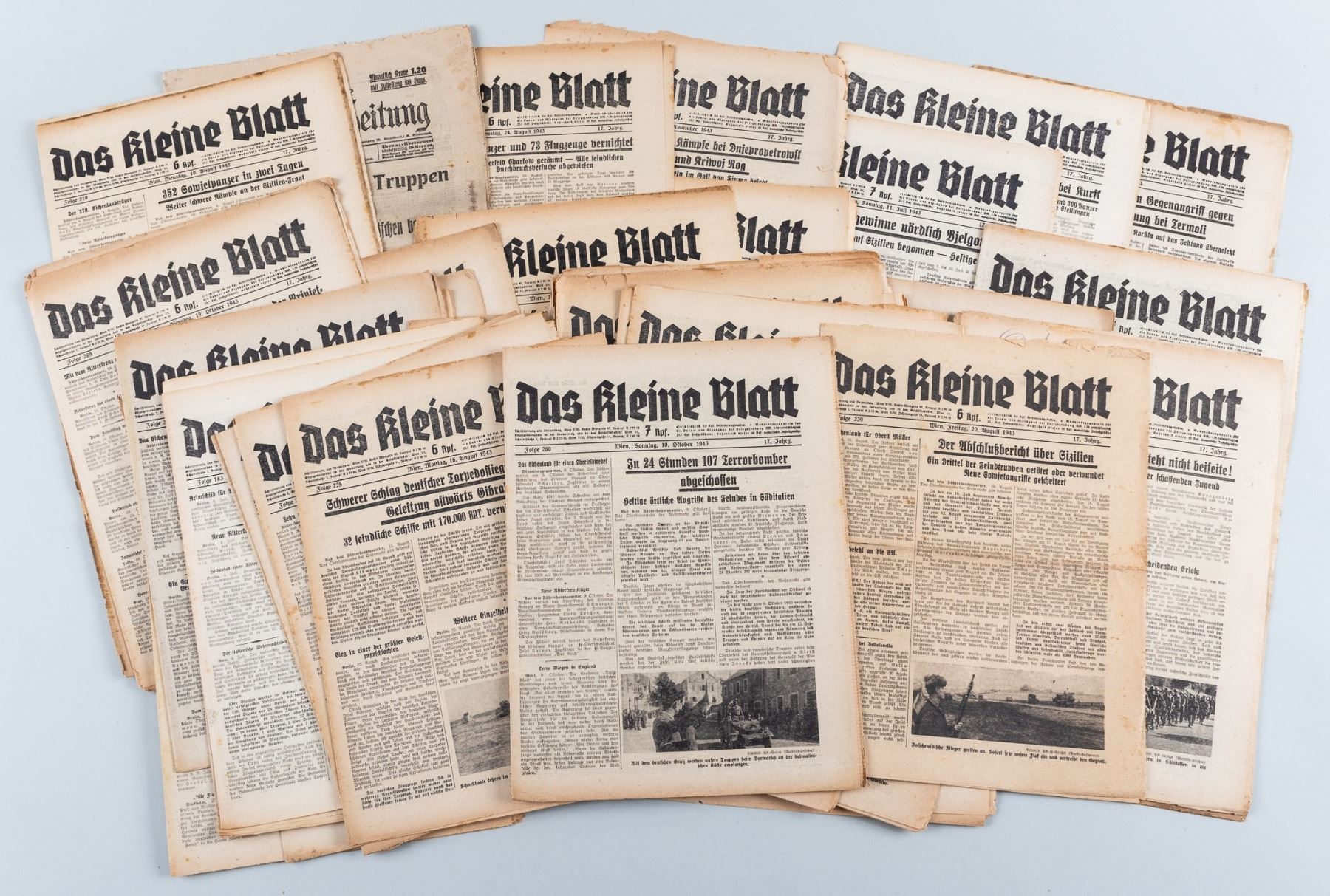 Large lot of 56 German newspapers. 55 newspapers are from 'Das Kleine Blatt', a German newspaper with issues from 1943 and 1944. Each newspaper has updates on the war, lists of the Knights Cross winners, obituaries for soldiers lost in the war, and photos of Nazi leaders like Hitler, Galland, Goebbels, and Goering. Included in the lot is one newspaper from 1914. The headline commemorates the German invasion of Russia and mentions a German aerial attack on a Russian plane. Approx. 12.5 x 9.5 inches. Chipping at edges.