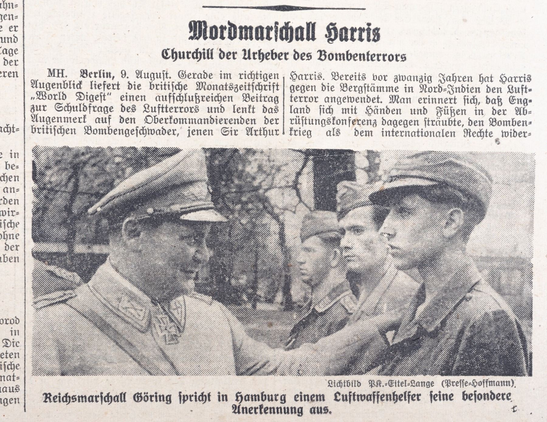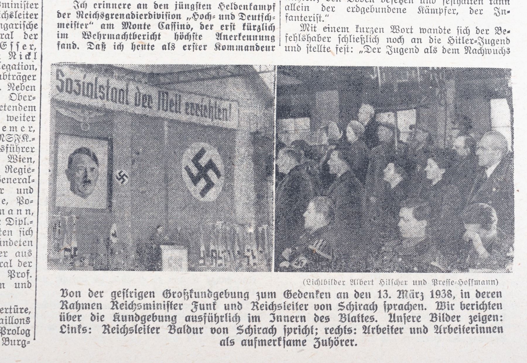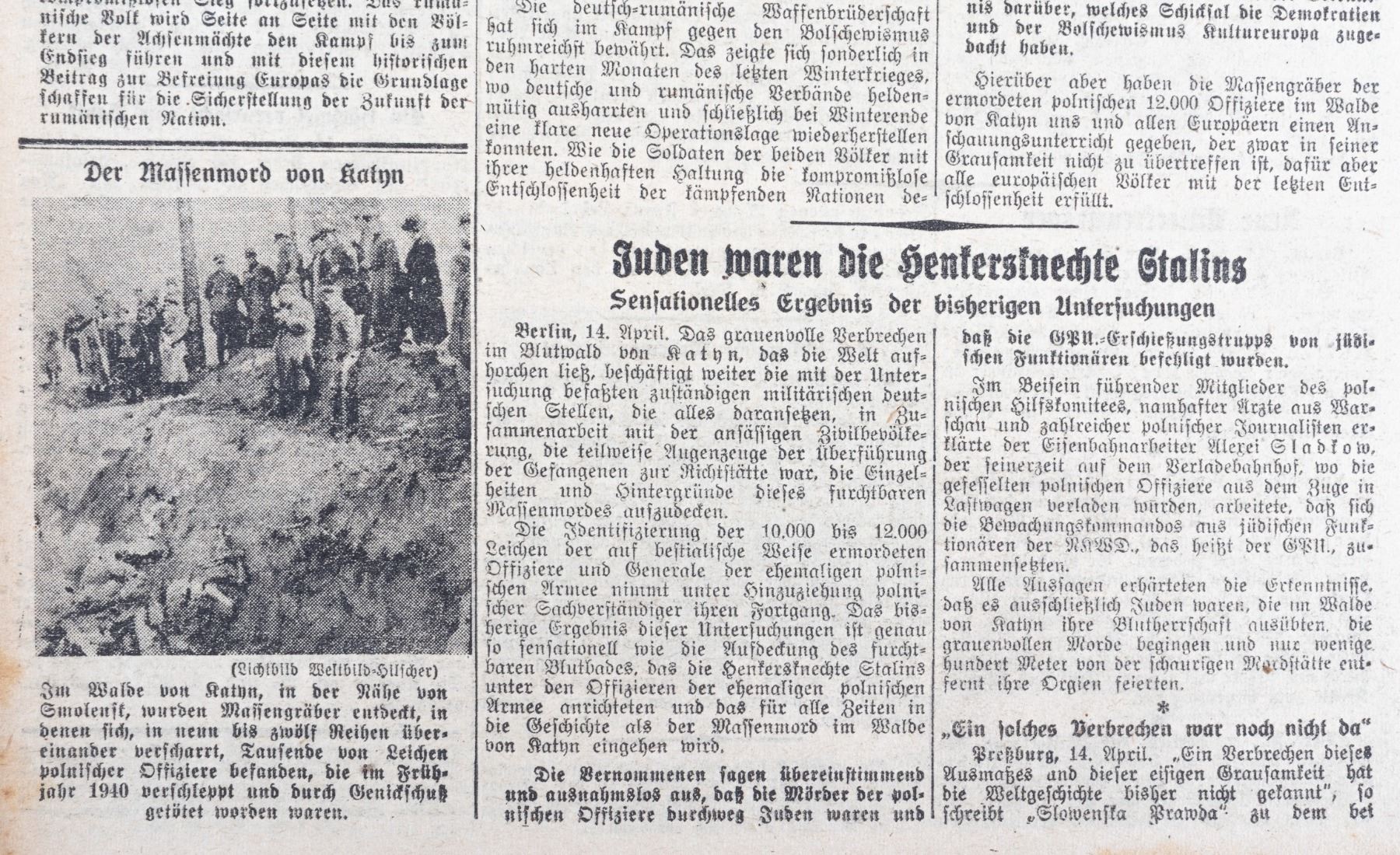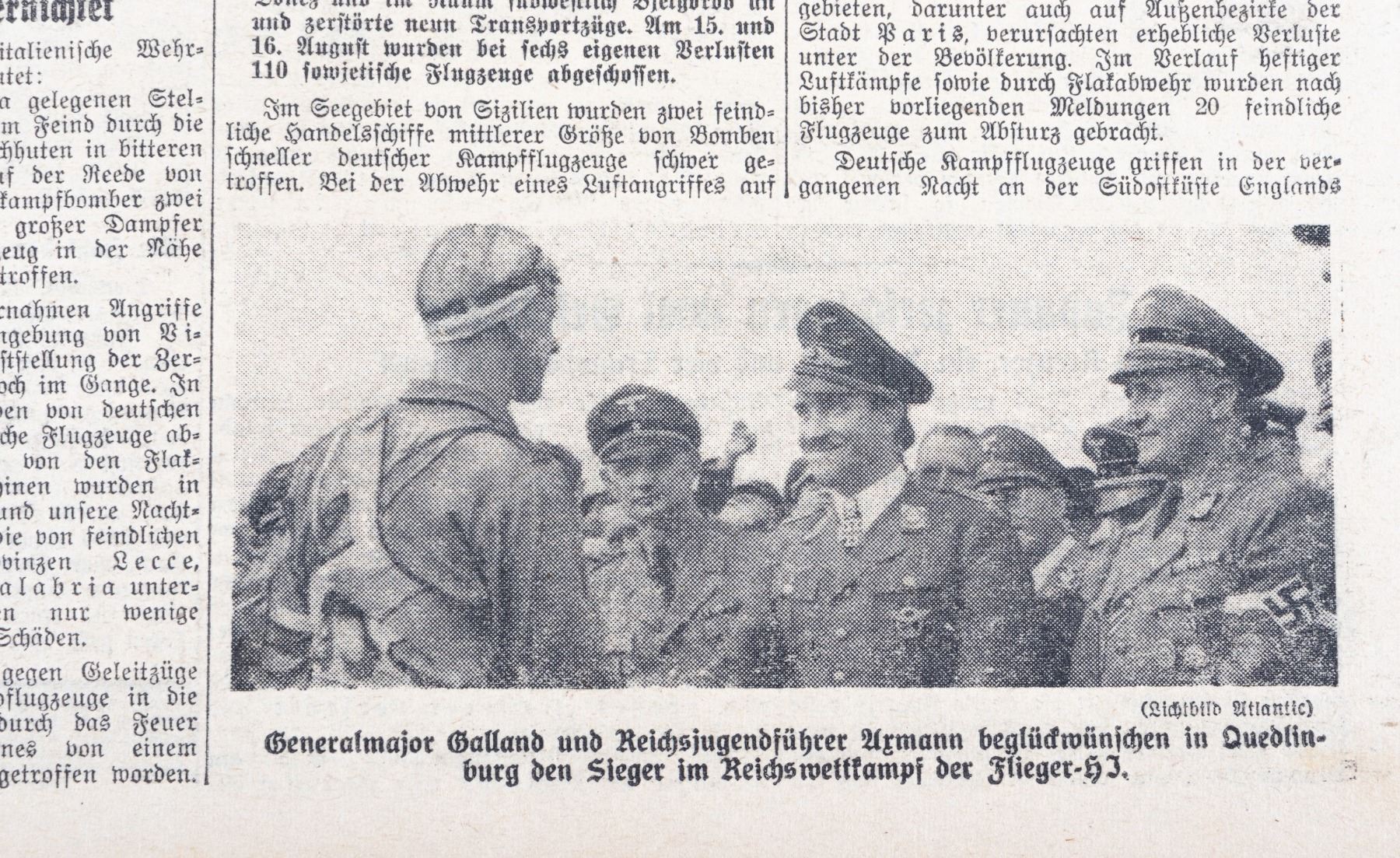 Large lot of 56 German newspapers. 55 newspapers are from 'Das Kleine Blatt', a German newspaper with issues from 1943 and 1944. Each newspaper has updates on the war, lists of the Knights Cross winners, obituaries for soldiers lost in the war, and photos of Nazi leaders like Hitler, Galland, Goebbels, and Goering. Included in the lot is one newspaper from 1914. The headline commemorates the German invasion of Russia and mentions a German aerial attack on a Russian plane. Approx. 12.5 x 9.5 inches. Chipping at edges.