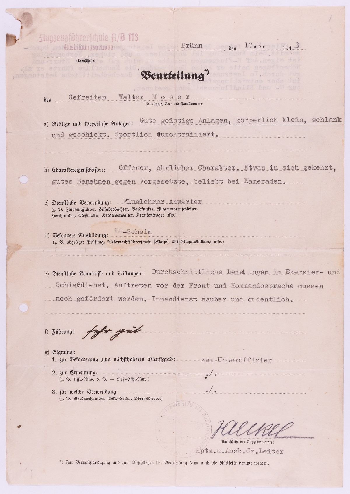 Group of documents and photos for Walter Moser (b. 1922), a young German soldier applying to become a flight instructor. Includes a large charcoal portrait 11.75 x 16.75 inches; three documents, assessments of his character and flying capabilities; and 14 photographs. The charcoal drawing has several taped tears; documents bear chips and tears, with staple marks; creases on photographs. 18 pieces.