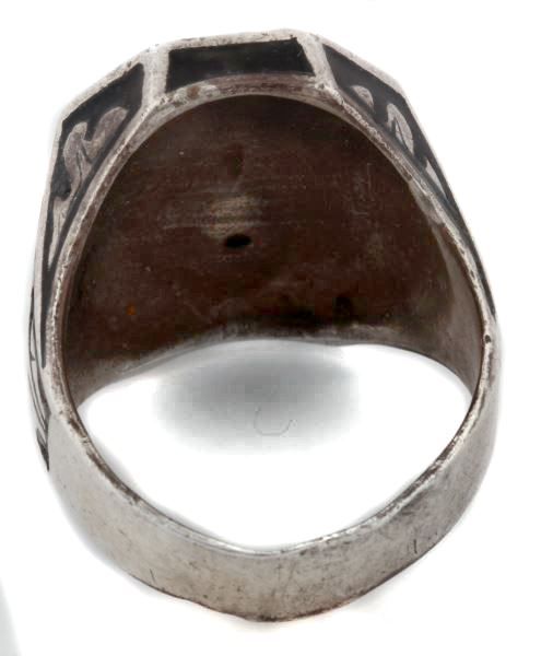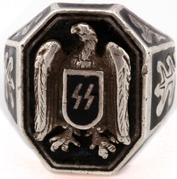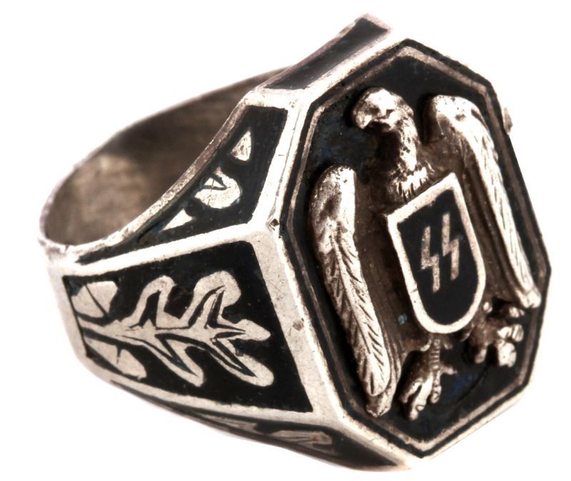 Eagle motif in relief on field of black enamel holding shield adorned with SS runes. Enameled sides with oak leaves. Inside marked with "835." Size 13, total weight 19.1 grams. Very good condition showing minor wear. This lot has a reserve.