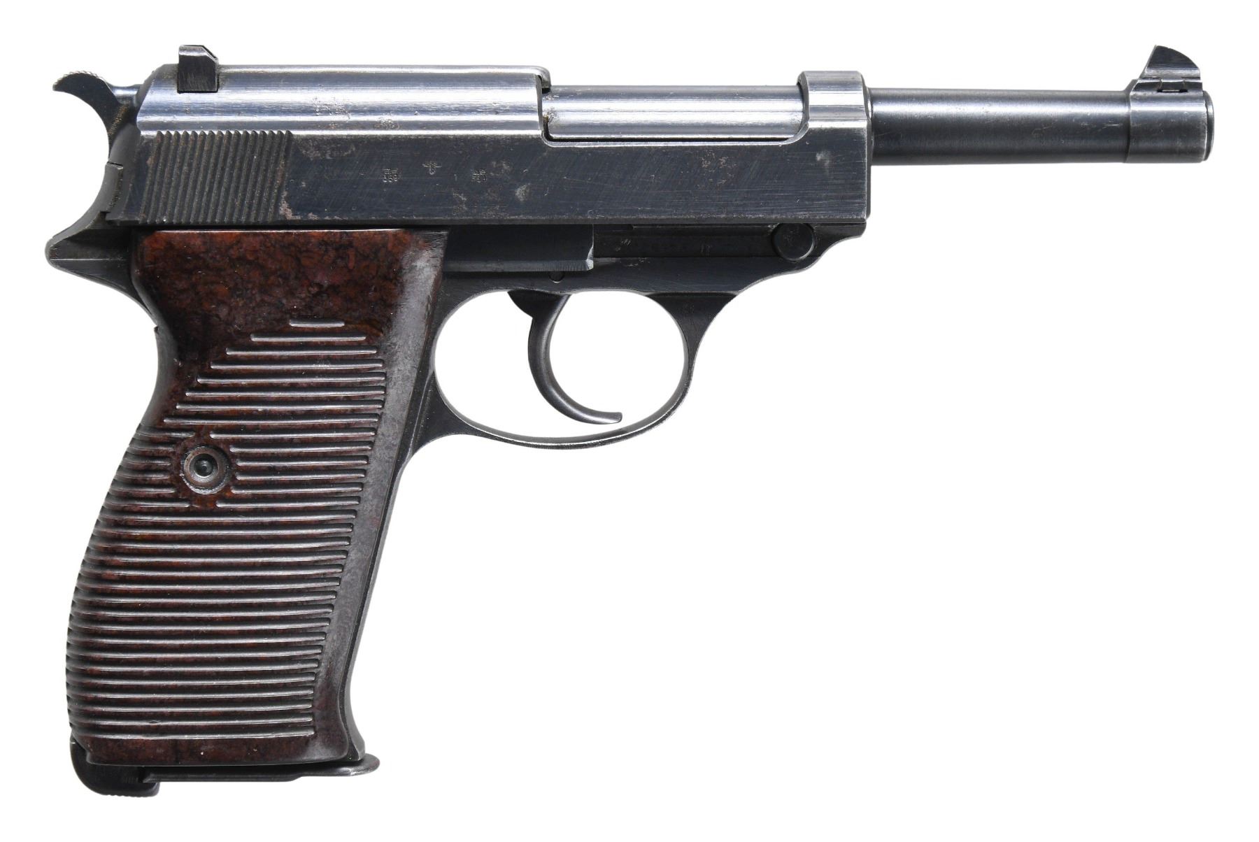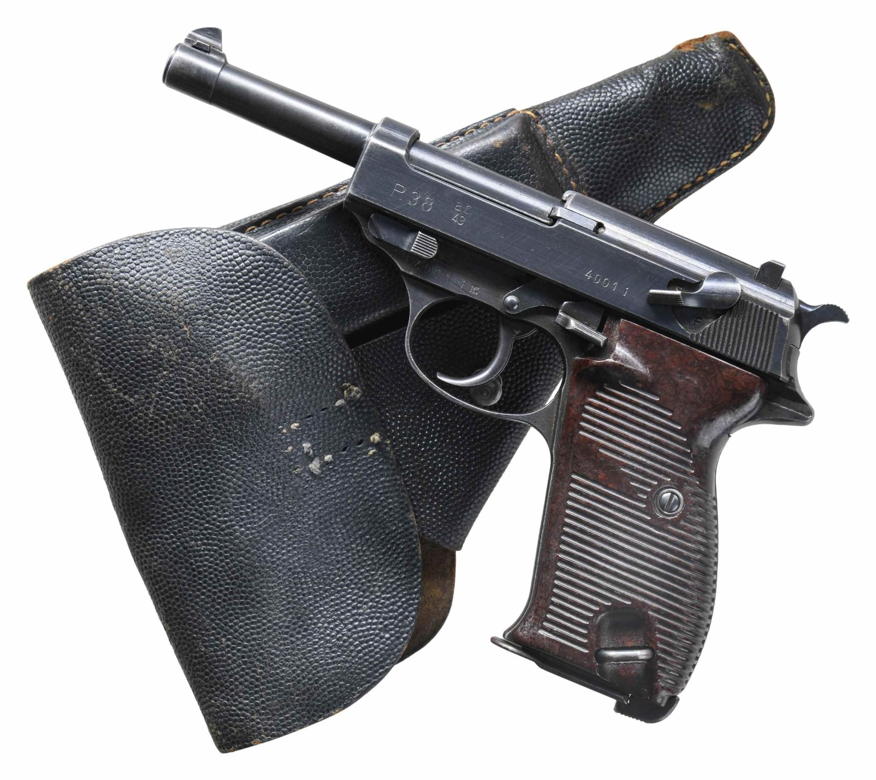 SEMI-AUTOMATIC PISTOL WITH HOLSTER. Cal. 9mm Luger. S# 4001i. Bbl. 4 7/8". P.38 semi-automatic pistol mfg. by Walther in 1943. Left side of the slide is marked "P.38", followed by Walther's mfg. code and the 2-digit year of mfg. "ac/ 43", and the S#, with 2 Eagle/359 proofs and an eagle firing proof marked on the right. Metal components exhibit a salt blue finish overall. Frame is mounted with 2-piece grooved dark brown pressed resin grips. Dovetailed blade front sight with U-notch rear sight. All serialized parts are matching and include the frame, slide, bbl., and locking block. MAGS: 2 blued 8-rd. mags. marked with a Mauser Eagle/135 proof on the spines. UNATTACHED ACCESSORIES: pebble grain black leather holster mfg. by Hans Romer marked "bml/44" on the rear. CONDITION: metal components retain the majority of their original arsenal blue finish, showing areas of light to mild edge wear, with mild surface oxidation and pitting present on the right side of the slide. Very bright bore, exhibiting scattered spots of light to mild pitting, while retaining well defined rifling throughout. Proper manual mechanics, including the safety / decocking lever. Grips show scattered superficial handling marks, but are otherwise very good overall. Holster remains malleable, exhibiting some wear and scattered spots/areas of crazing, with a hole present on the right side of the toe. Closure flap strap and left belt loop are absent. PROVENANCE: Estate Collection of Nicholas Apergis. (25-3968/MLW). CURIO. $600-900.