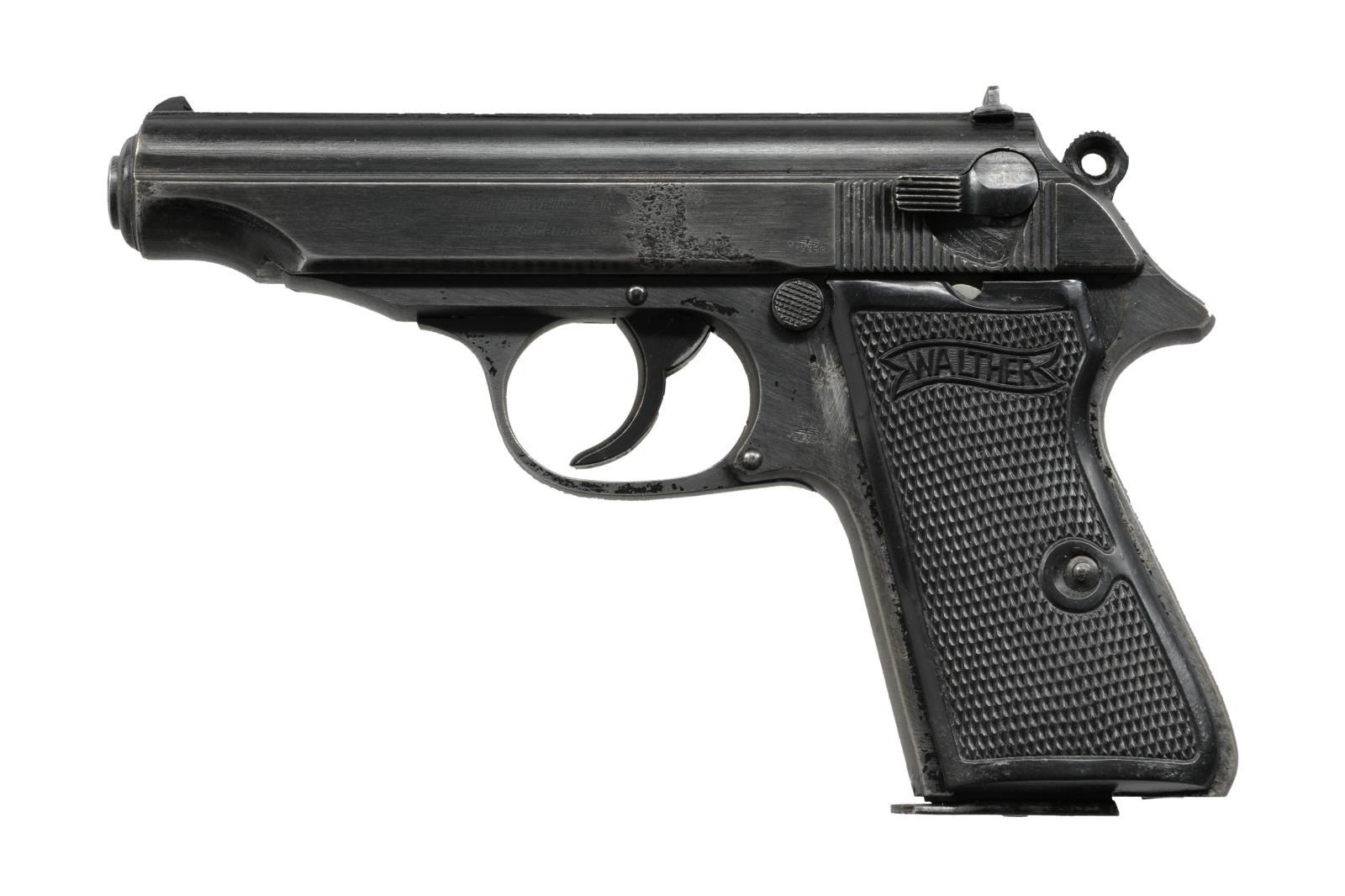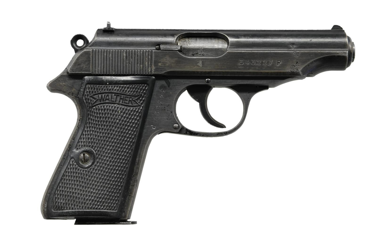 Cal. 7.65mm. S# 343227P. Bbl. 3 3/4" Wartime finish with slide factory markings nearly illegible. Matching numbers. MAGS: (1) 7rd Walther banner. CONDITION: Overall good arsenal reworked finish with strong proof stamps and areas of heavy pitting. Finish is worn on the high edges and straps. Good grips with mild handling marks. Bright bore with good rifling. (23-1841/ZAL) CURIO $500-700