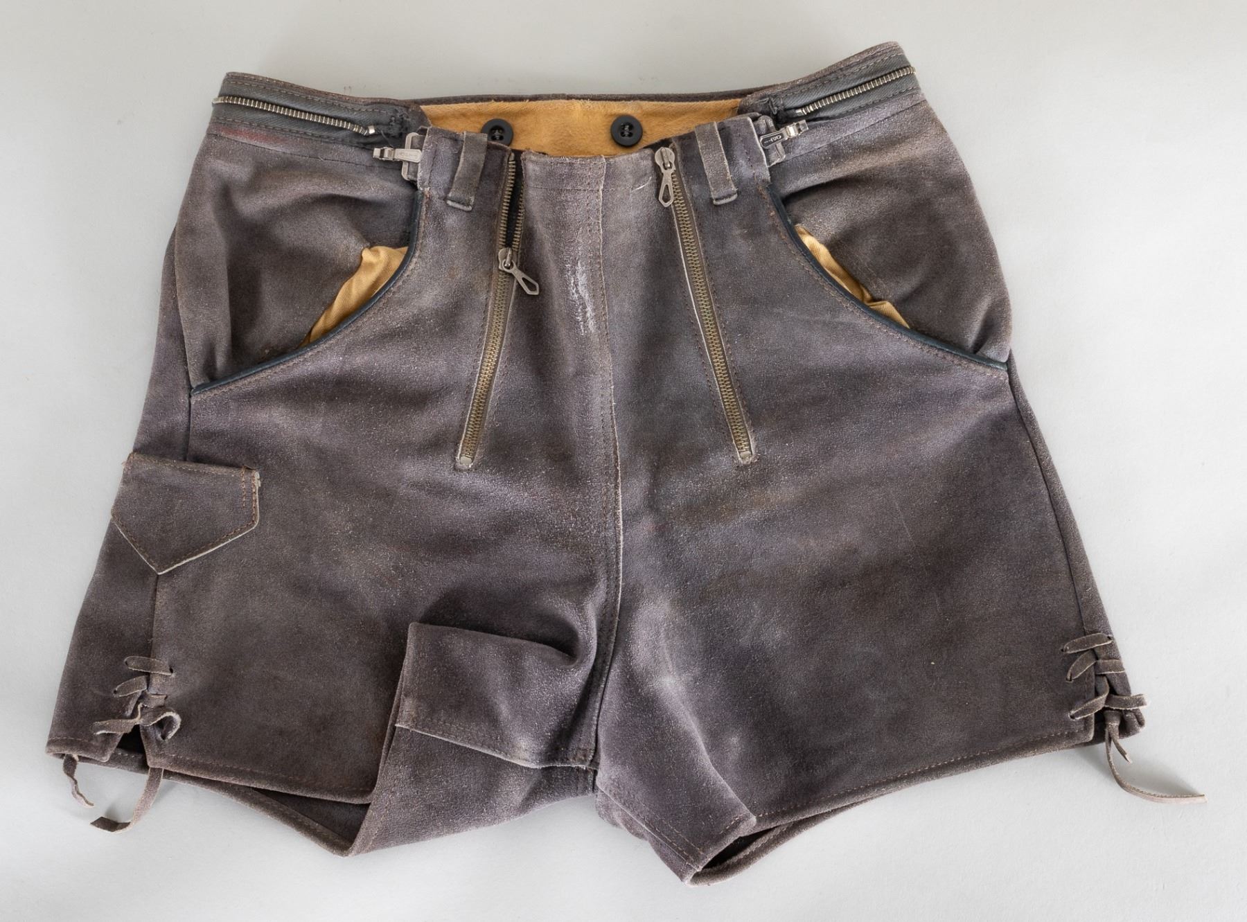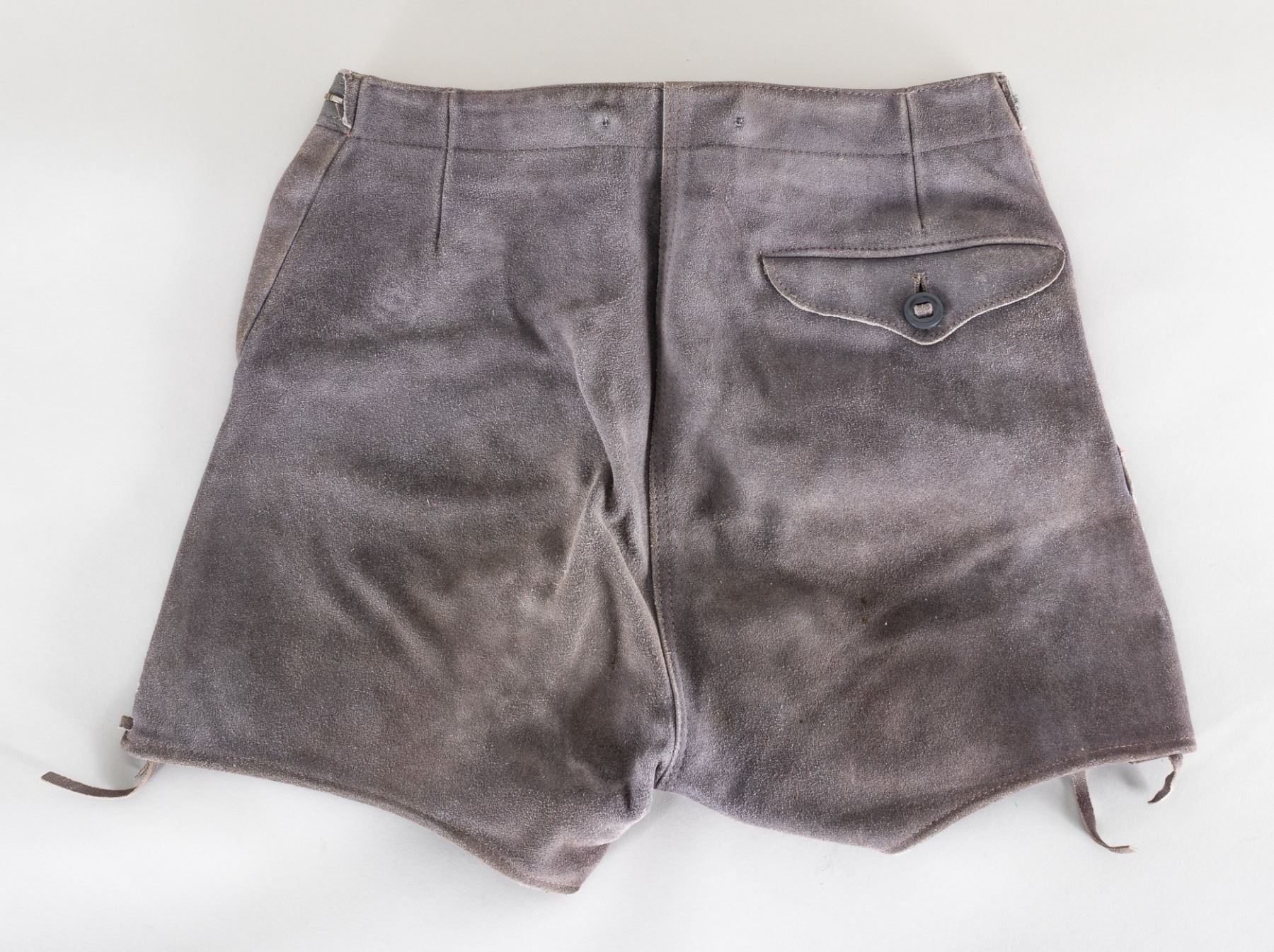 Gray suede leather shorts or lederhosen, perhaps for a Hitler Youth. Shorts stamped with '38' on inside waistband. Stamped on the inside of the shorts in several places is 'P 6 38 20741' possibly indication 1938 manufacture. Marked on inside waistband is 'A Getz'. Makers marked on metal clasps, 'Opti - Made in Germany'. 14.5 inches at the waist, 14 inches from waistband to hem.