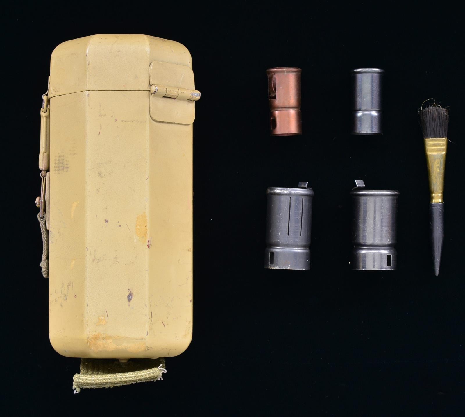 This lot consists of a ZF-41 scope case, brush, & two sets of rain shields. The scope case has a tan paint. The case is maker marked by "jvb" & it has a proper Waffenamt. Two sets of unmarked rain shields w/ two front & two rear. CONDITION: The case shows some flaking, scuffing & light oxidation staining. One rear rain shield is worn to a brown patina, other shield show silvering & light oxidation. PROVENANCE: from the estate collections of Charles P. Obremski. (02-16979-4/MJC). $500-700.