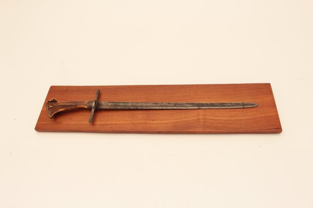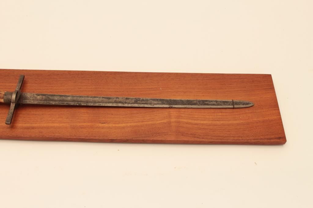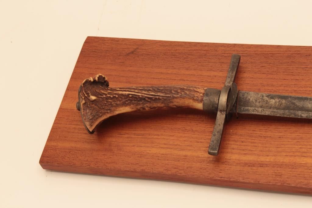 18th Century or earlier Germanic Hunting Sword with forged steel hilt and mounts along with stag horn grip. 21” overall with a 16” blade. Scattered light pitting and erosion. Mounted on wood plaque. Many carried inAmerican Revolution and Colonial era. Est: $175-$350