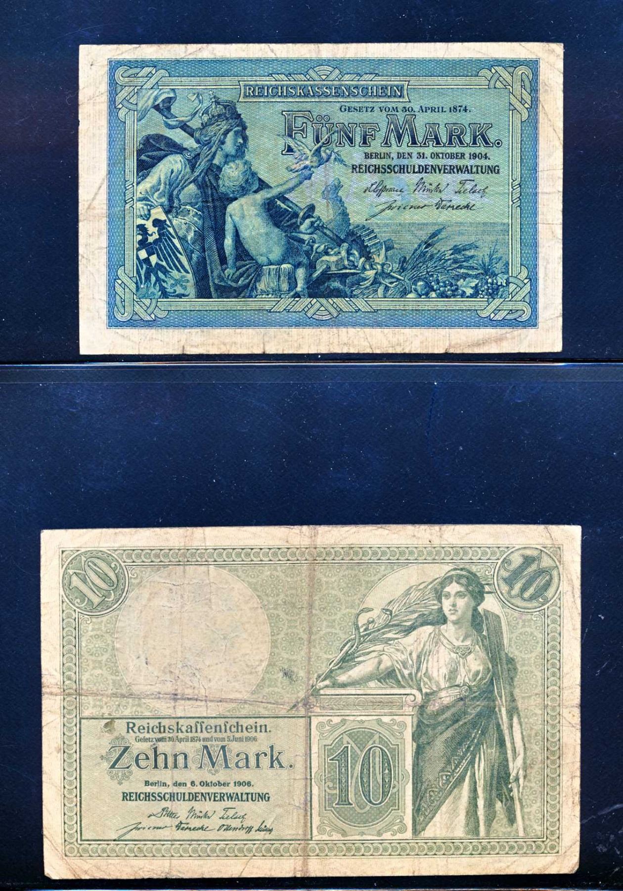 A Selection of notes with Pick # P-8b to P-79 highlighted by 5 Mark 1904 P-8b in Fine and 10 Mark 1906 P-9b in Fine.