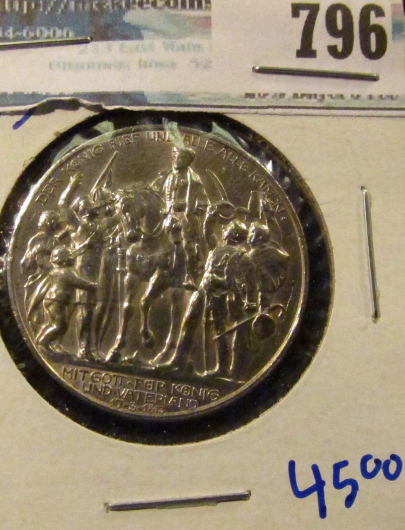 GERMANY 1913 THREE MARK COIN WITH A MAN ON HORSEBACK RIDING INTO TOWN SURROUNDED BY TOWNSPEOPLE