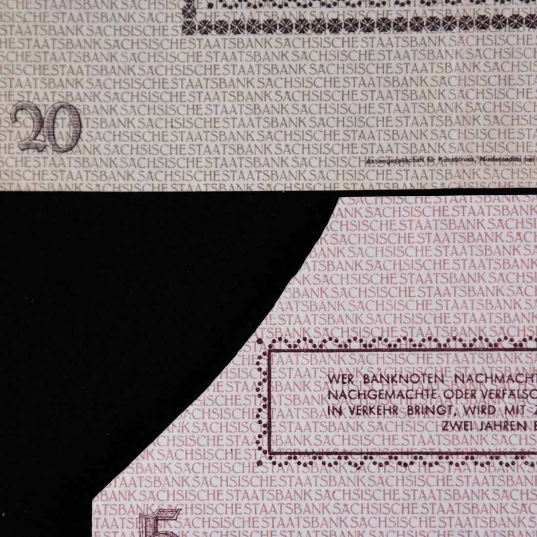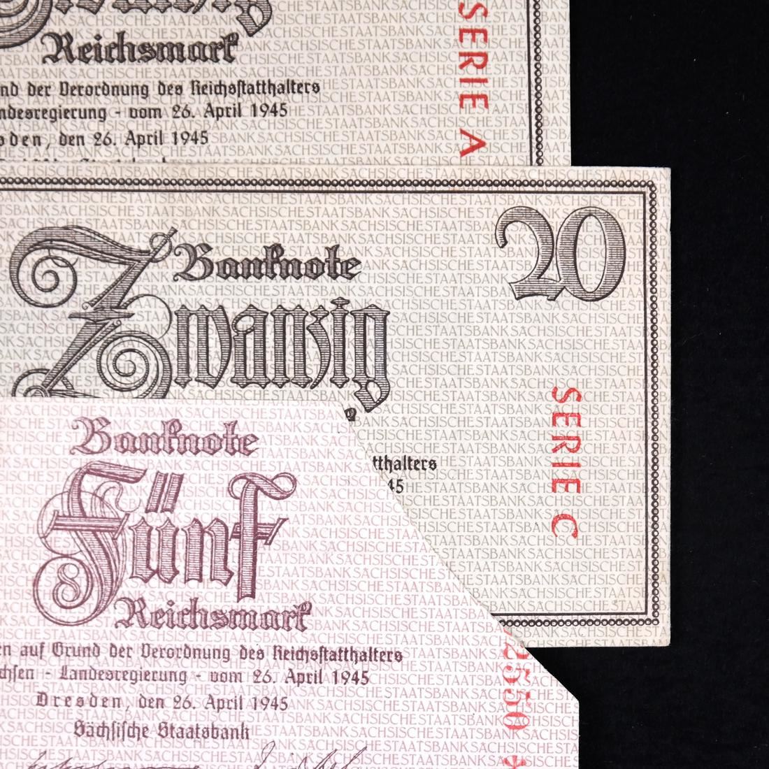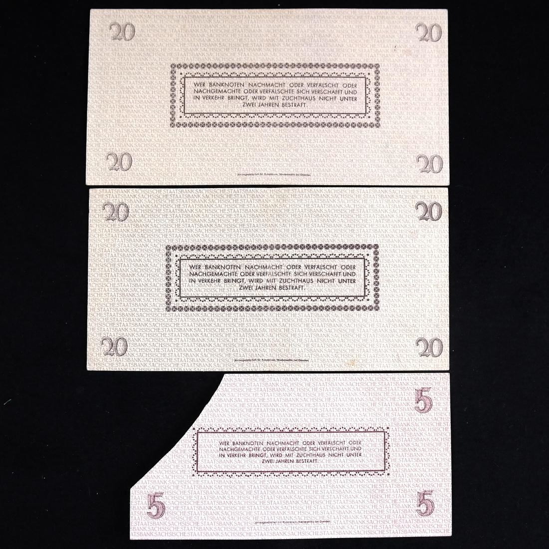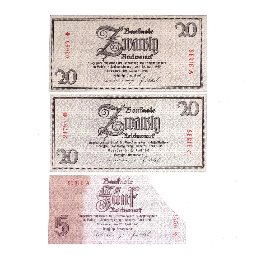 Includes 5Mk series A (clipped), 20Mk series A About Uncirculated, and 20Mk series C About Uncirculated. (Stanley Gibbons II NASCA auction of December 7-10, 1981 lot #923)
