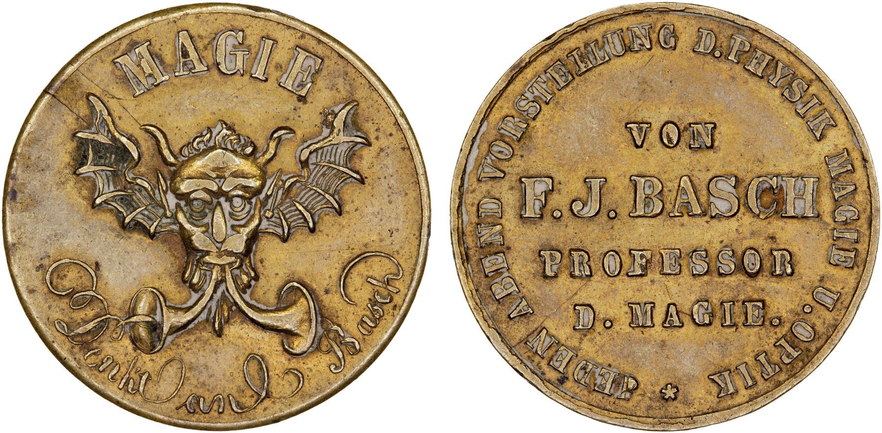 GERMANY: AE token, ND, Kuethe-MT30, TC-283836, N-372616, 21mm, struck circa 1870, MAGIE above winged devil's head at center, DENKT ANL BASCH below in cursive script // JEDEN ABEND VORSTELLUNG D. PHYSIK MAGIE U. OPTIK / VON / F.J. BASCH / PROFESSOR / D. MAGIE, lustrous fields, AU. Friederich Joseph Basch (1833-1877), his brothers Ernst (1838-1908) and Heinrich (1841-1876) and their father Hirsch Wilhelm Basch formed what became known as the Basch magical dynasty. Ernst stopped performing professionally in 1887 thereby ending the family tradition.
